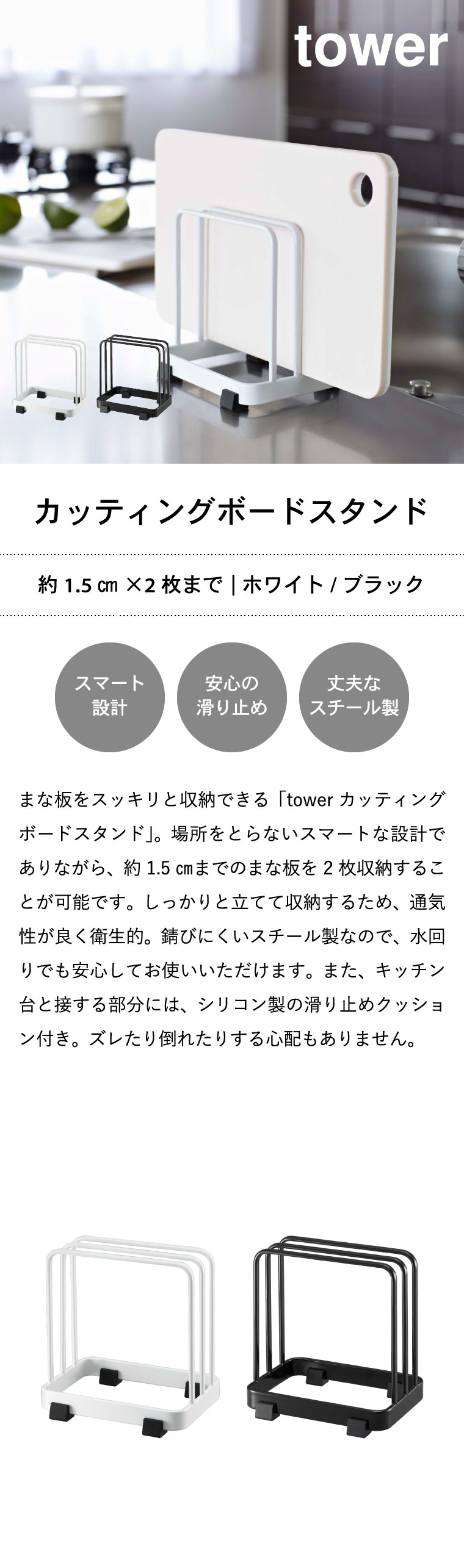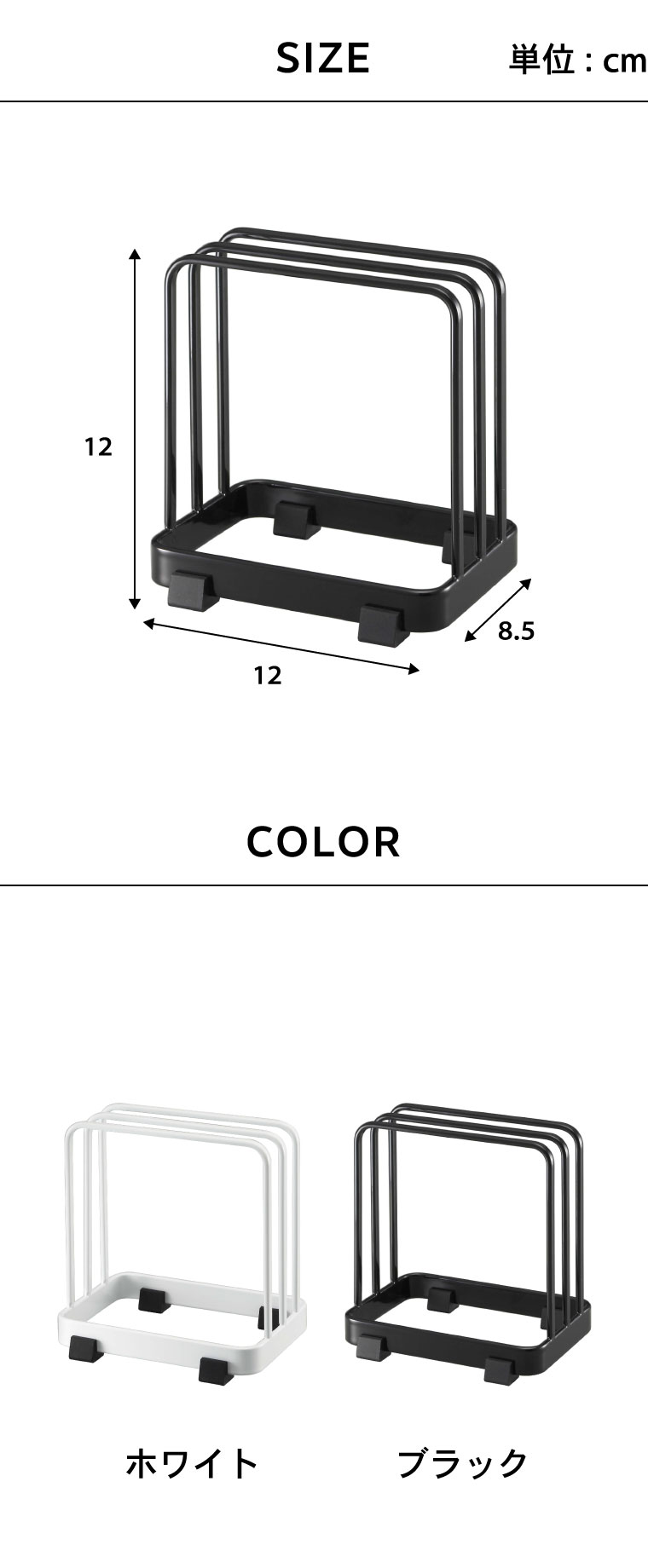 ●商品サイズ:約12X8.5X12cm ●商品重量:約260g ●素材・材質:本体:スチール(ユニクロメッキ+粉体塗装) ●対応サイズ:まな板:厚み約1.5cmまで2枚収納可能 ●JANコード:4903208071352 4903208071369