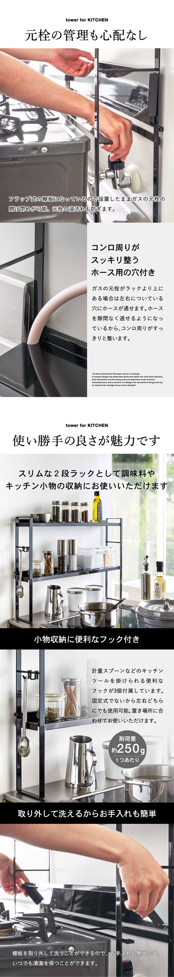 コンロ奥隙間ラック 2段 タワー 山崎実業 tower ホワイト/ブラック 5221 5222 タワーシリーズ