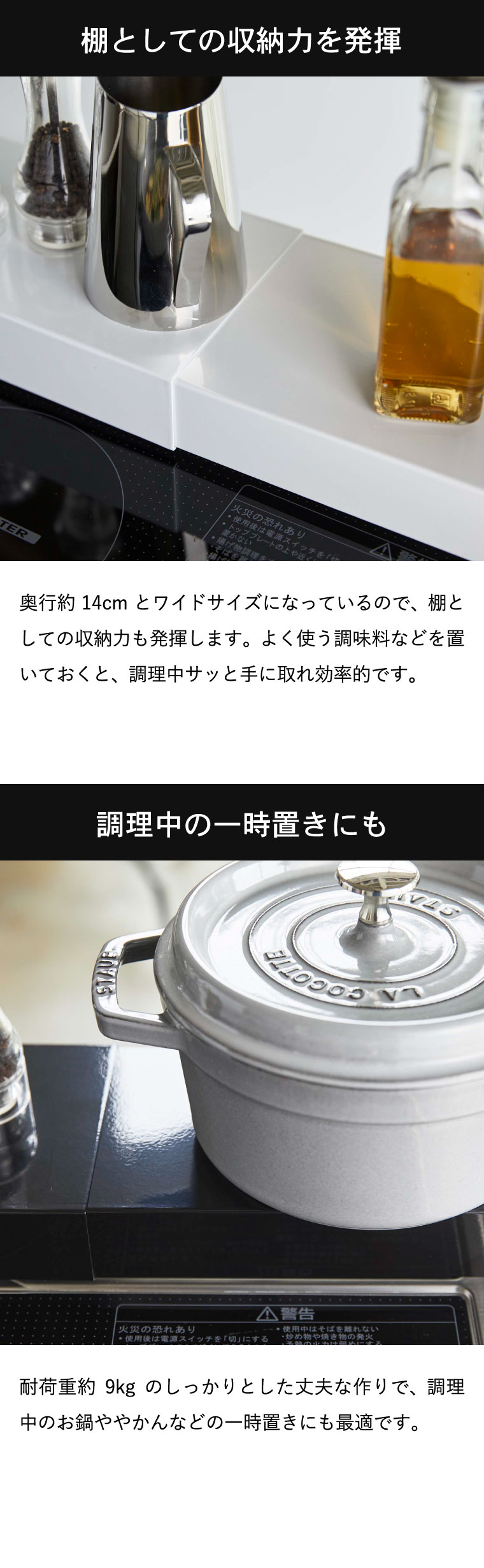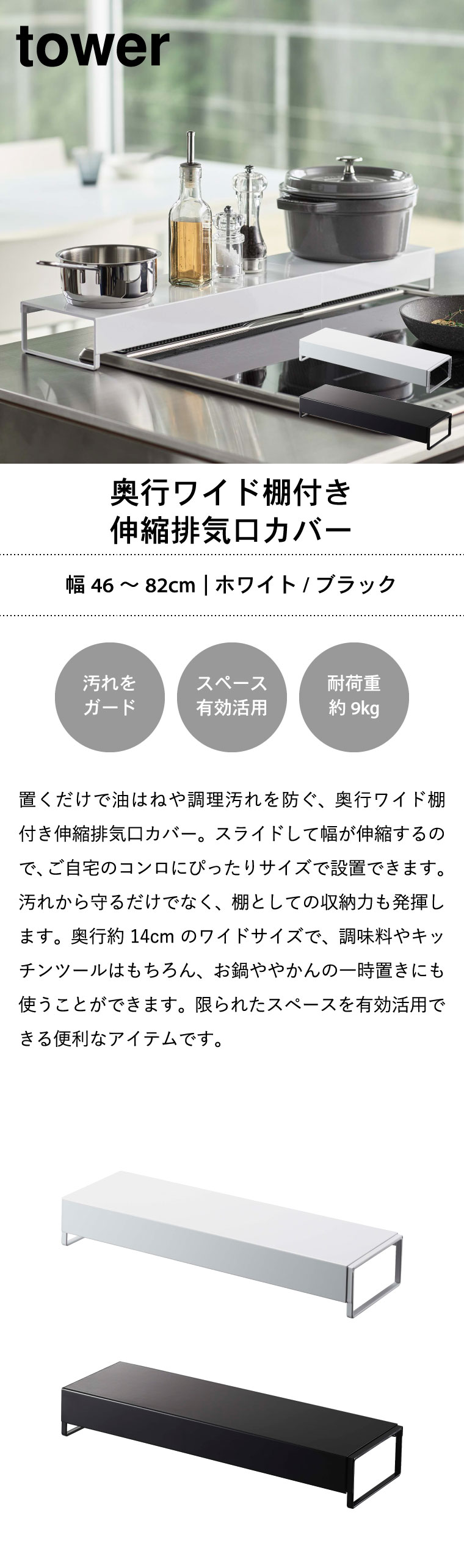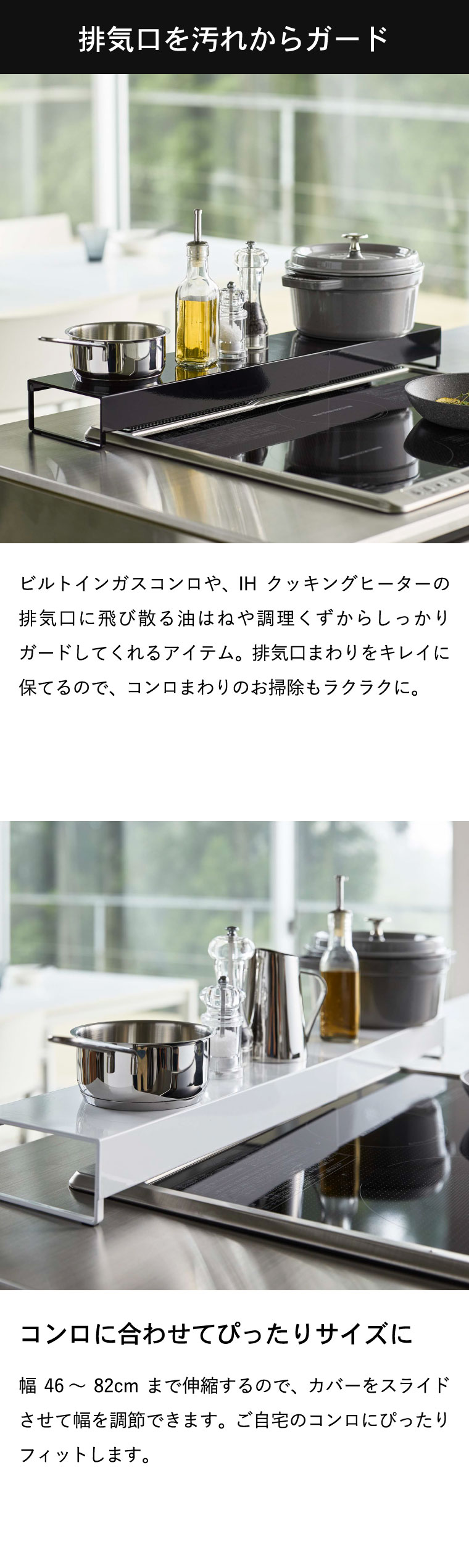●商品サイズ:約46~82X14X6.7cm ●商品重量:1500g ●素材・材質: 本体:スチール(粉体塗装) ●耐荷重:約9kg ●対応サイズ:幅約44~80cmまでのビルトインガスコンロ、IHクッキングヒーター 排気口カバーの高さ:約1.8cm以下 ●JANコード:4903208052481 4903208052498