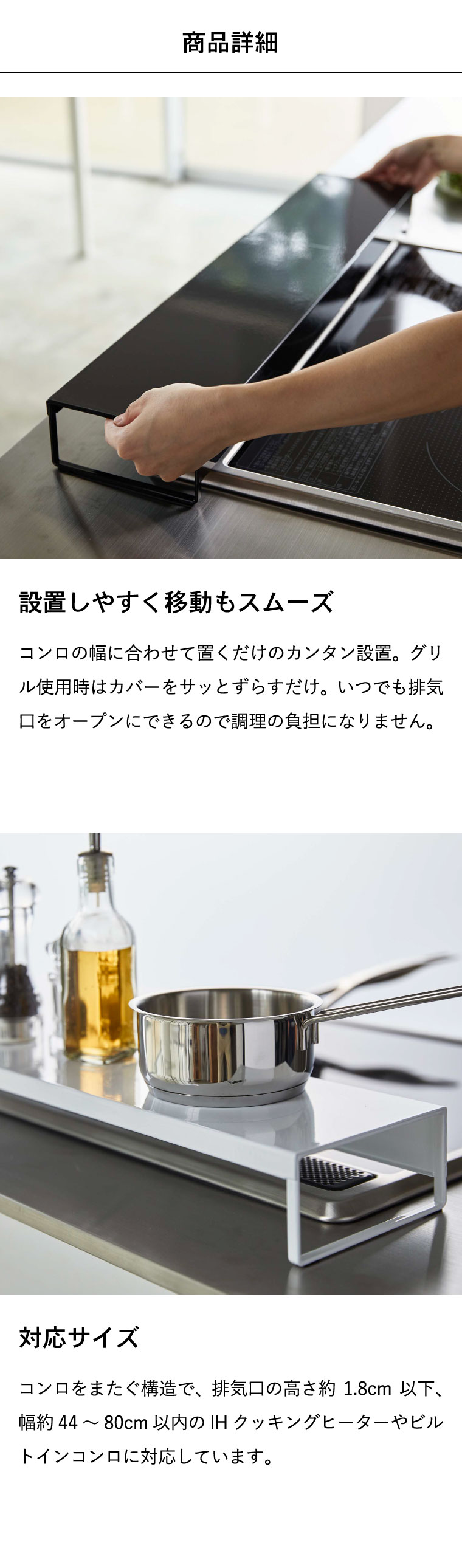 ●対応サイズ:幅約44~80cmまでのビルトインガスコンロ、IHクッキングヒーター 排気口カバーの高さ:約1.8cm以下