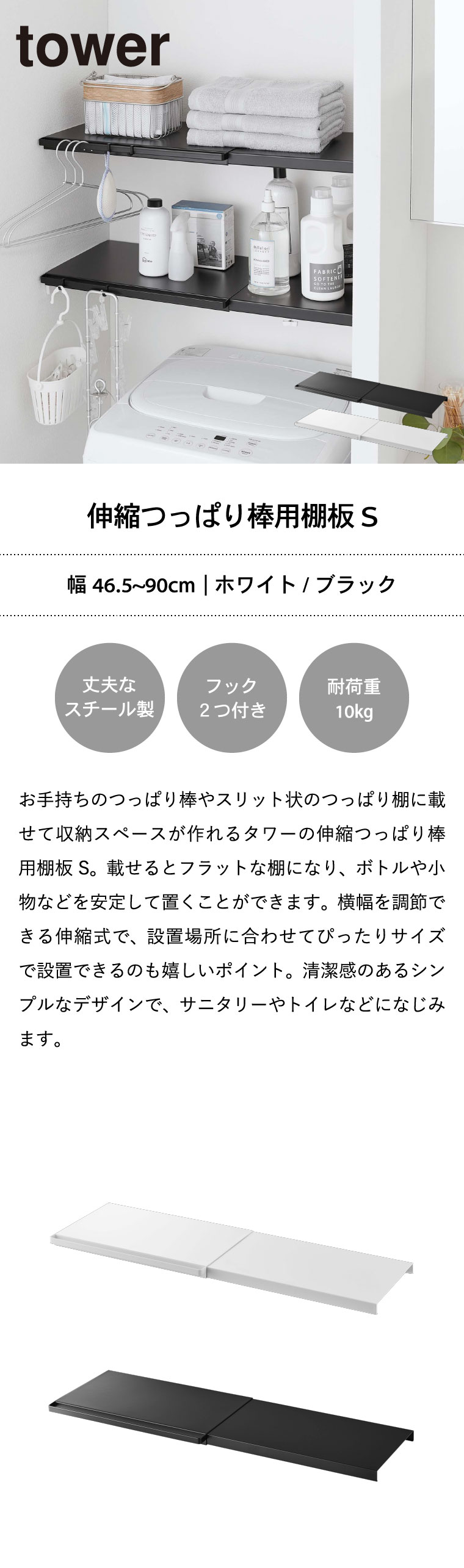 ●商品サイズ:約46.5~90X29X3cm ●商品重量:1900g ●素材・材質: 本体:スチール(粉体塗装) ●耐荷重:ご使用のつっぱり棒・つっぱり棚の耐荷重から、本製品の重さ約2kgを引いた重さ ●JANコード:4903208053204 4903208053211