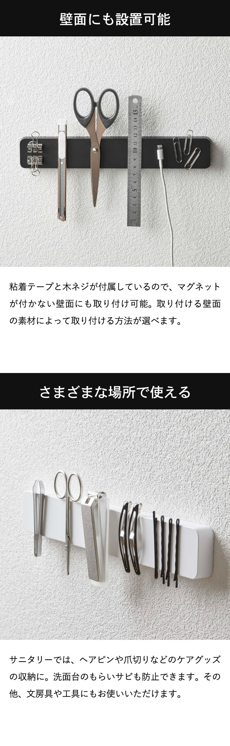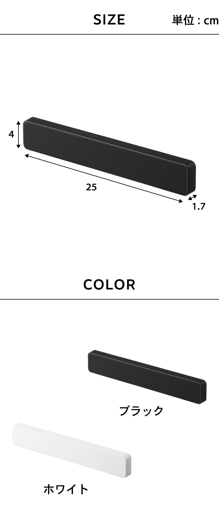 ●商品サイズ:約25X1.7X4cm ●商品重量:約330g ●素材・材質: 本体:ABS樹脂 マグネット 滑り止め:シリコーン ●付属品:木ネジ×2 壁面用粘着テープ×2 ●耐荷重:約1.5kg ●耐熱:100℃ ●耐冷:-40℃ ●JANコード:4903208051996 4903208052009