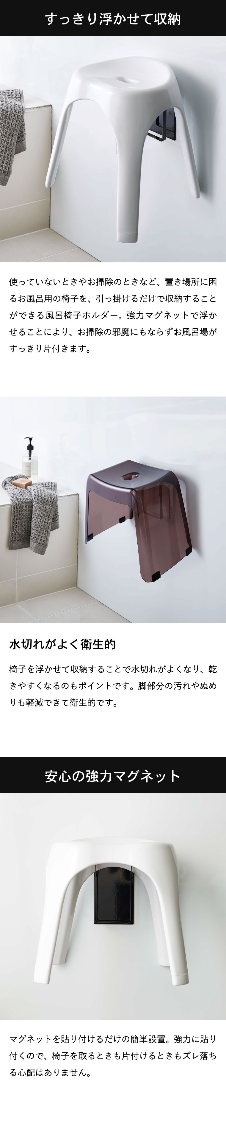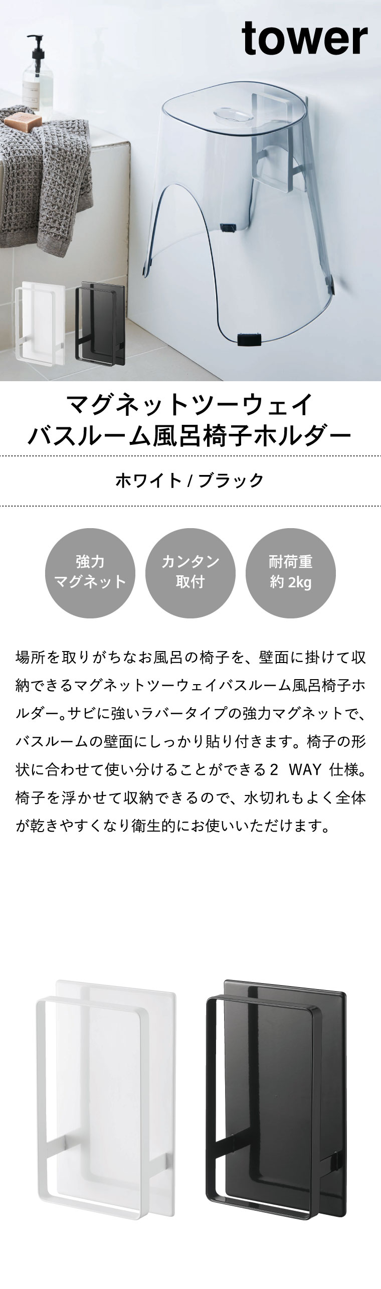 マグネットツーウェイバスルーム風呂椅子ホルダー タワー 山崎実業 tower ホワイト/ブラック 5395 5396 タワーシリーズ マグネット