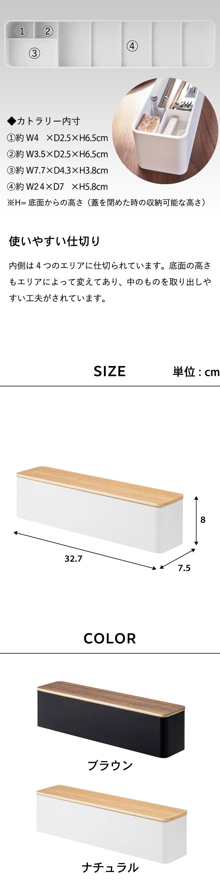 ●内寸サイズ: (1)約W4×D2.5×H6.5cm(2)約W3.5×D2.5×H6.5cm(3)約W7.7×D4.3×H3.8cm(4)約W24×D7×H5.8cm※H=底面からの高さ(蓋を閉めた時の収納可能な高さ)