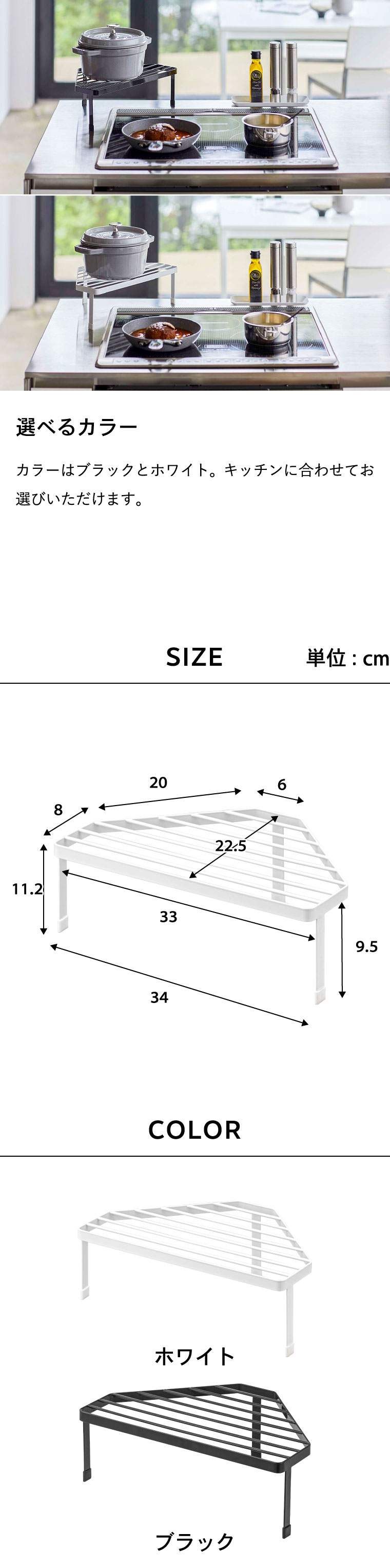 ●商品サイズ:約34X22.5X11.2cm ●商品重量:約500g ●素材・材質: 本体:スチール(粉体塗装) キャップ:シリコーン ●耐荷重:約5kg ●耐熱:200℃ ●食洗機不可 ●対応サイズ:高さ約9.5cm以内の排気口カバーに対応 ●組立式 ●JANコード:4903208052566 4903208052573