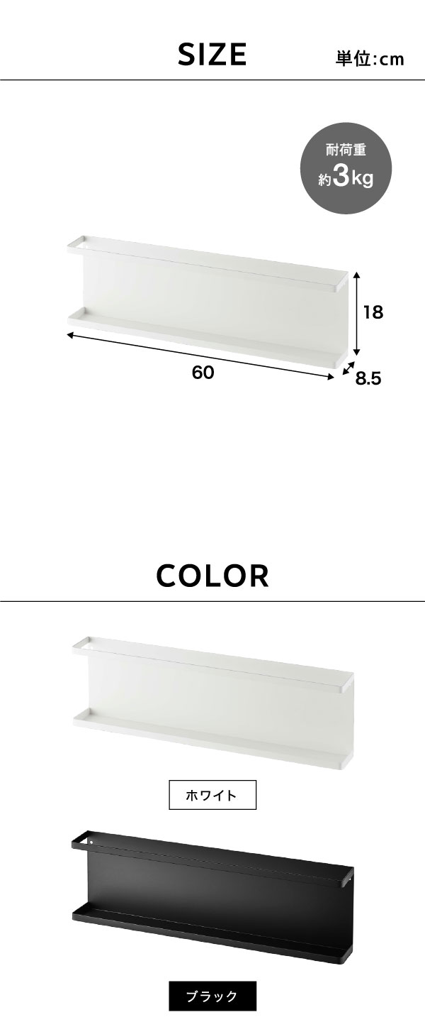 ●商品サイズ:約60X8.5X18cm ●商品重量:約1700g ●素材・材質: 本体:スチール(粉体塗装) ●付属品:フック×2 石こうボードピンセット×2 木ネジ×2 ●耐荷重:本体:約3kg フック1つあたり:約250g ●JANコード:4903208054768 4903208054775