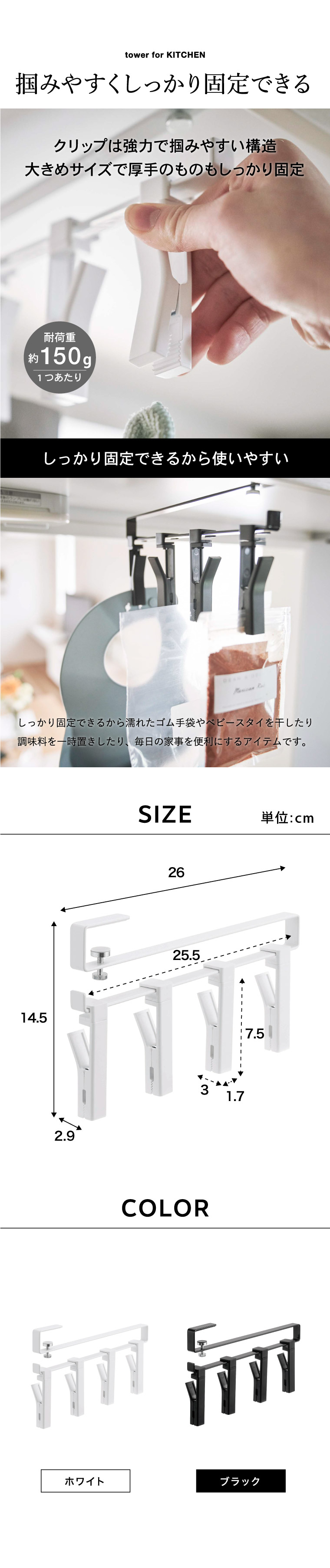 ●耐荷重:約600g(クリップ1つあたり約150g)