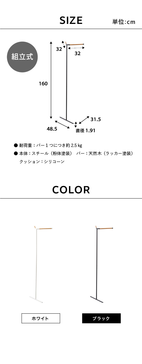 ●商品サイズ:約48.5X31.5X160cm ●商品重量:約1180g ●素材・材質: 本体:スチール(粉体塗装) バー:天然木(ラッカー塗装) クッション:シリコーン ●耐荷重:バー1つにつき約2.5kg ●食洗機不可、レンジ不可 ●組立式 ●JANコード:4903208055505 4903208055512