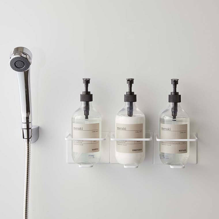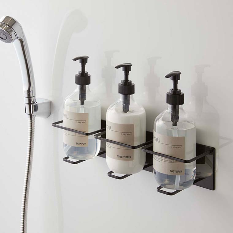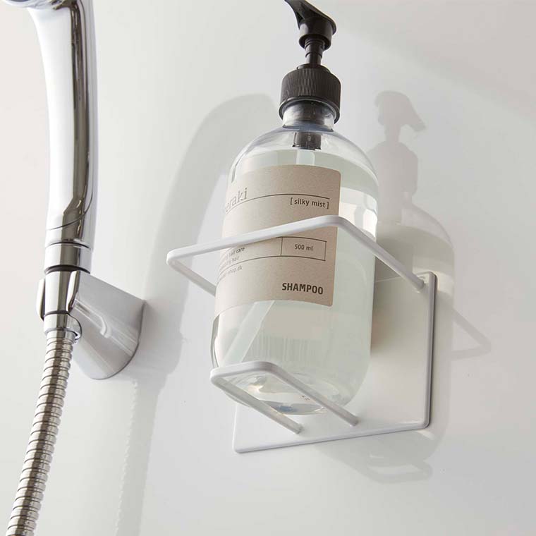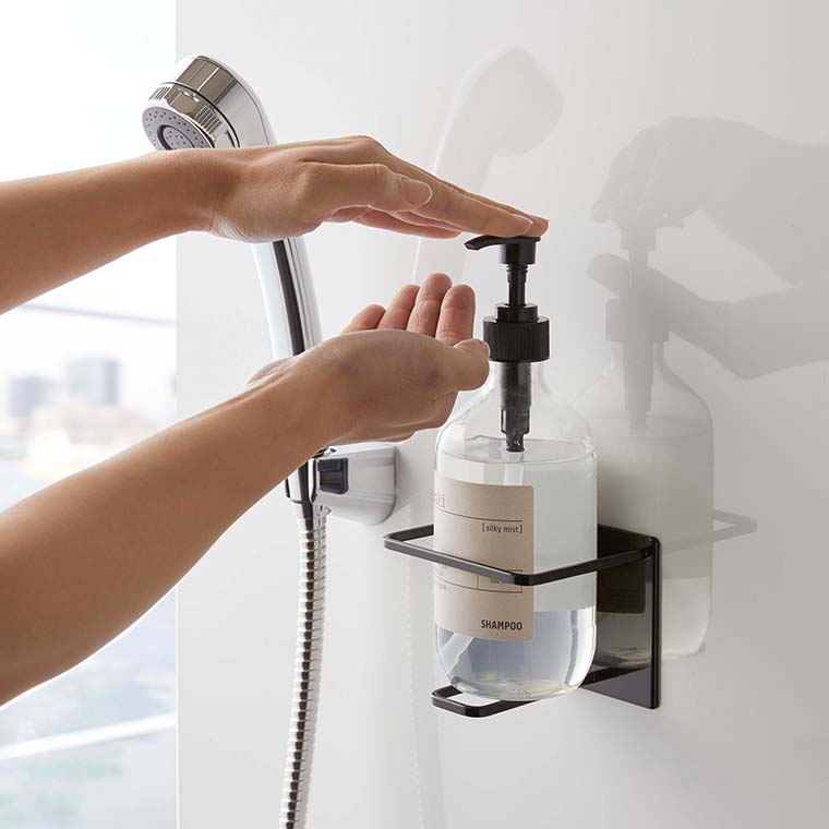 シャンプーやボディーソープなどのボトルを収納。そのまま押して使用できます。上から入れるだけの簡単設計。底に当たる接地面を少なくすることでぬめりを防止。