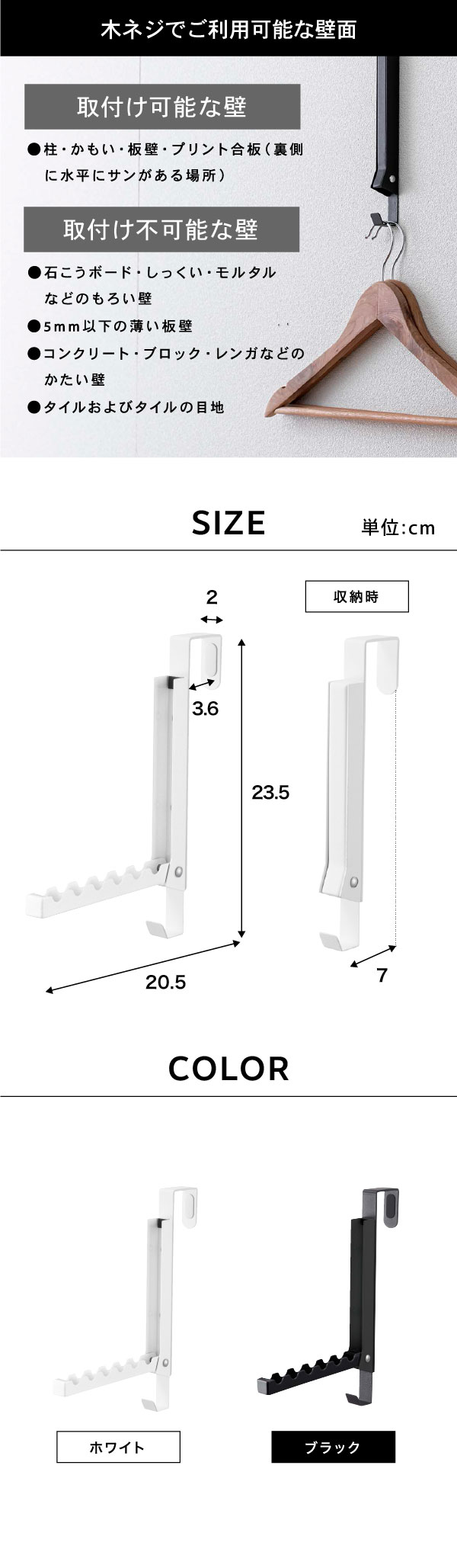 ●商品サイズ:約2X7~20.5X23.5cm ●商品重量:(約)230g ●素材・材質: 本体:スチール(粉体塗装) ●付属品:木ネジ×2 ●耐荷重:約7kg(フック・凹1つあたり:約1kg) ●JANコード:4903208055147 4903208055154