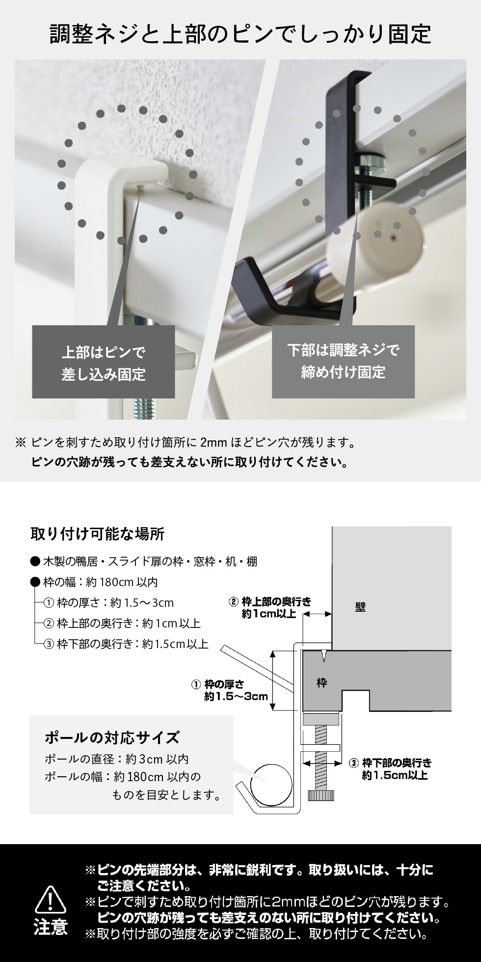 ●対応サイズ:ポールの直径:約3cm以内・幅180cm以内のものを目安としています。枠の幅:幅約180cm以内 (1)枠の厚さ:約1.5cm~3cm (2)枠上部の奥行き:約1cm以上 (3)枠下部の奥行き:約1.5cm以上