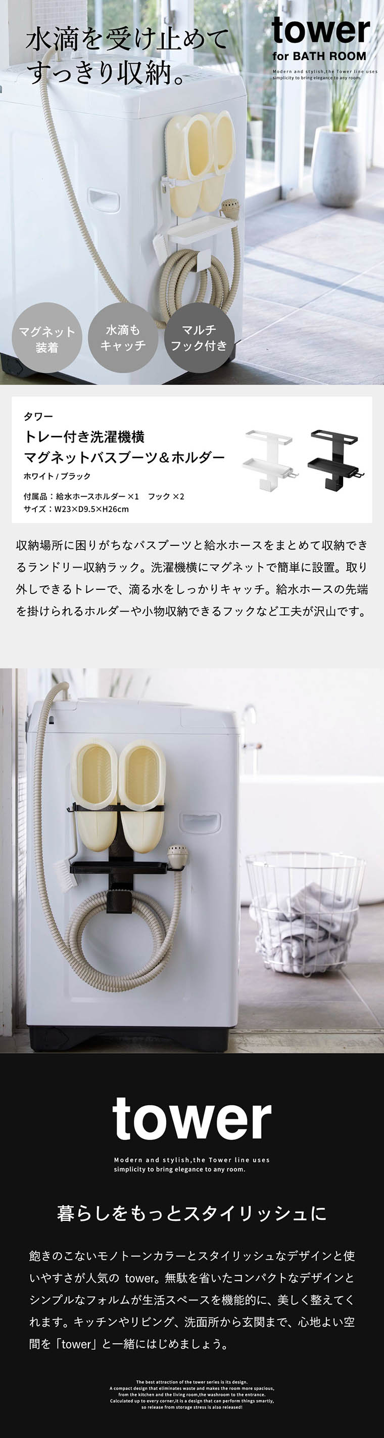 トレー付き洗濯機横マグネットバスブーツ&ホースホルダー タワー 山崎実業 tower ホワイト/ブラック 5637 5638タワーシリーズ マグネット