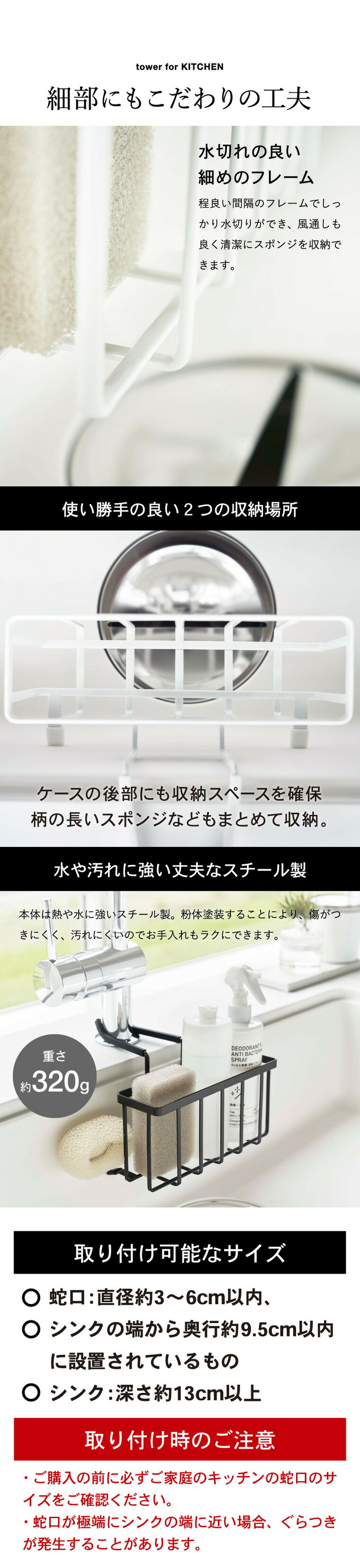 ●対応サイズ:蛇口:直径約3~6cm以内、シンクの端から奥行約9.5cm以内に設置されているもの シンク:深さ約13cm以上 ※ご購入の前に必ずご家庭のキッチンの蛇口のサイズをご確認ください。