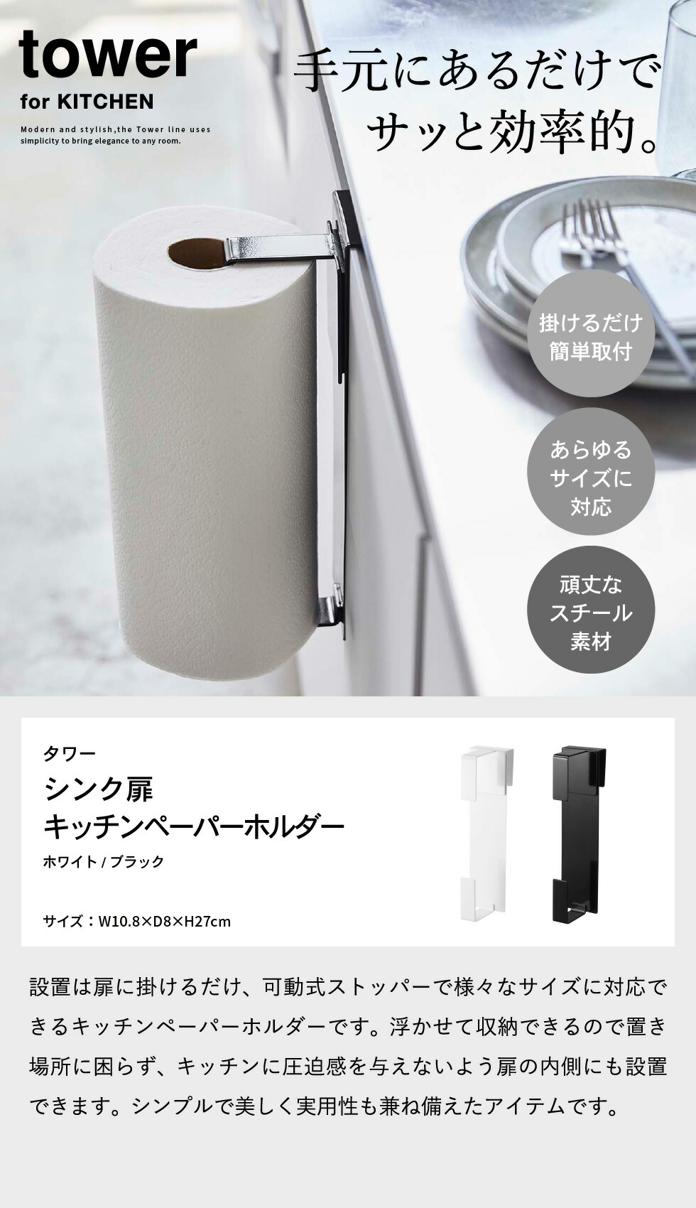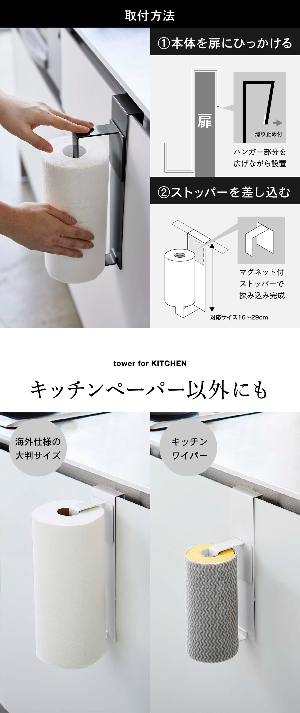 ●対応サイズ:直径約15cm・高さ約15~28cm以内・芯の直径約3cm以上のキッチンペーパーロール 扉の幅:本品の幅約7.5cm以上(扉のハンドル等を含まず) 扉の厚さ:約1.5~2.5cmまで 扉と上部との隙間:約3mm以上