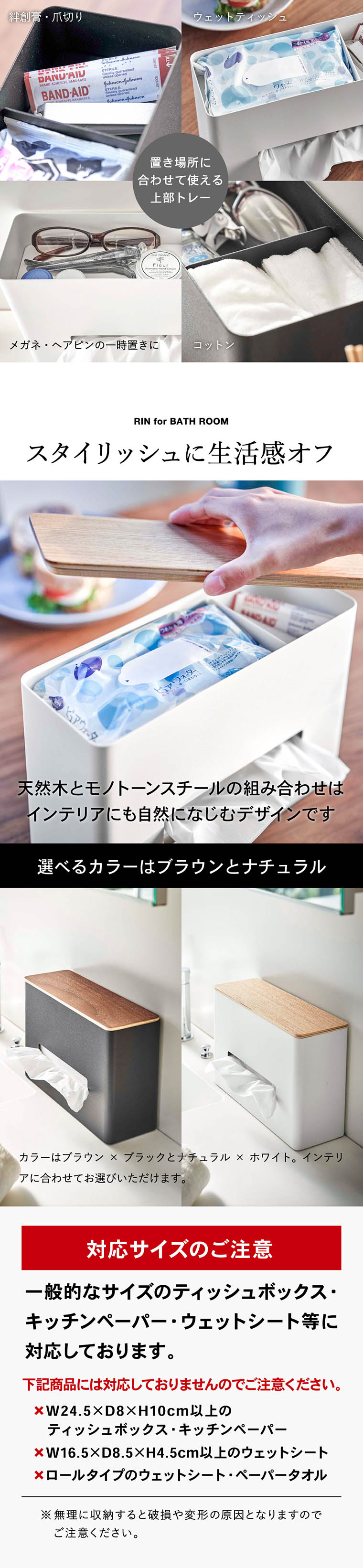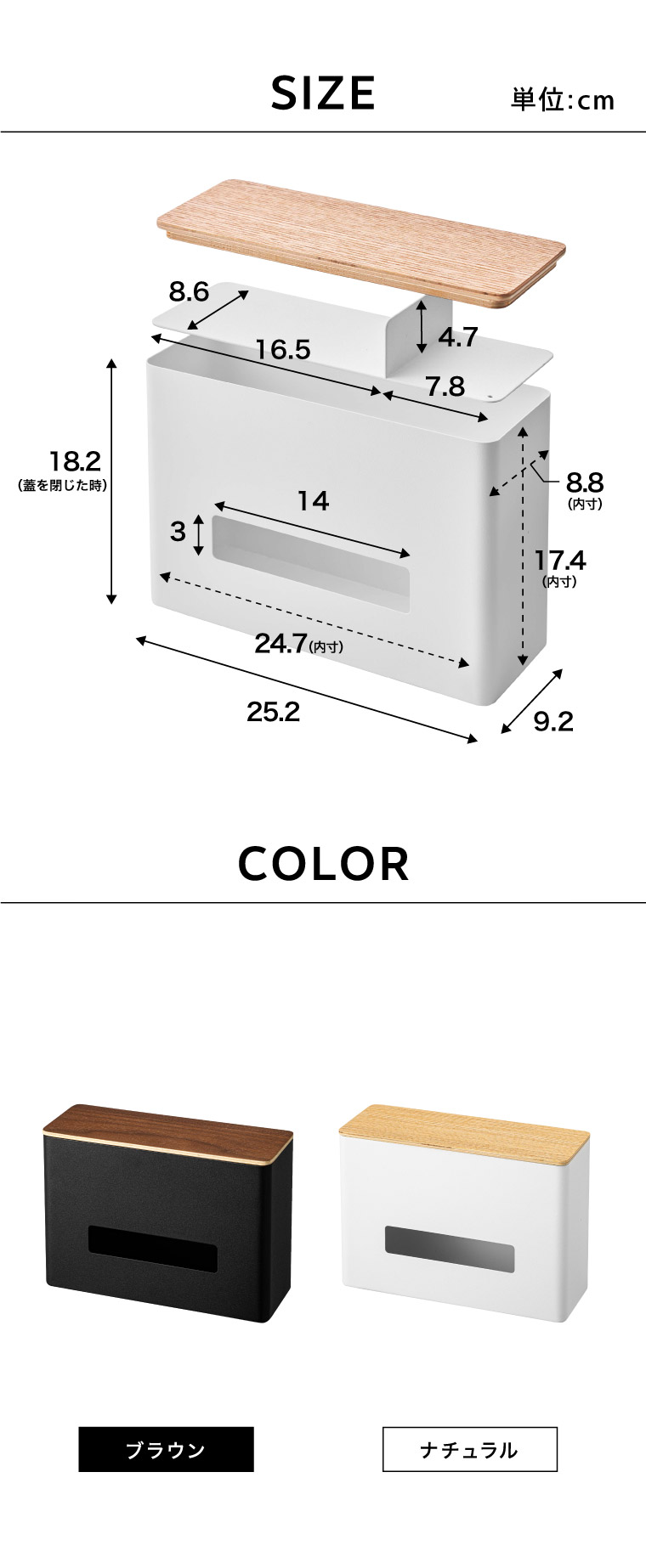 ●内寸サイズ: 容器:約W24.7×D8.8×H17.4cm ティッシュボックス収納部:約W24.7×D8.3×H11.7cm 仕切りトレー:(大)約W16.7×D8.6×H4.7cm (小)約W7.8×D8.6×H4.7cm ティッシュ取り出し口:約W14×H3cm