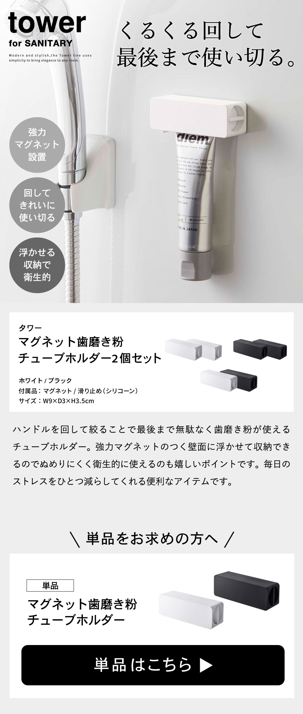 マグネット 歯磨き粉チューブホルダー タワー 2個セット 山崎実業 tower ホワイト/ブラック 5627 5628 磁石 タワーシリーズ