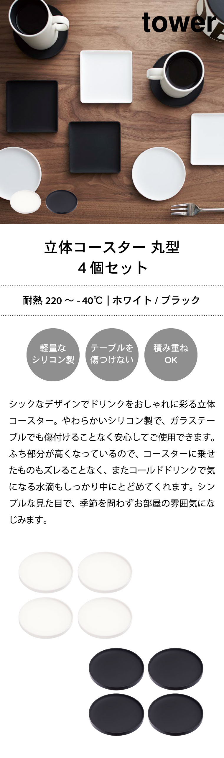 立体コースター 丸型 タワー 4個セット 山崎実業 tower ホワイト/ブラック 2538 2539 / タワーシリーズ