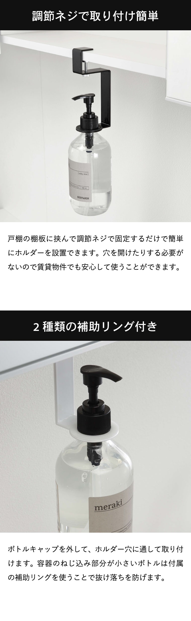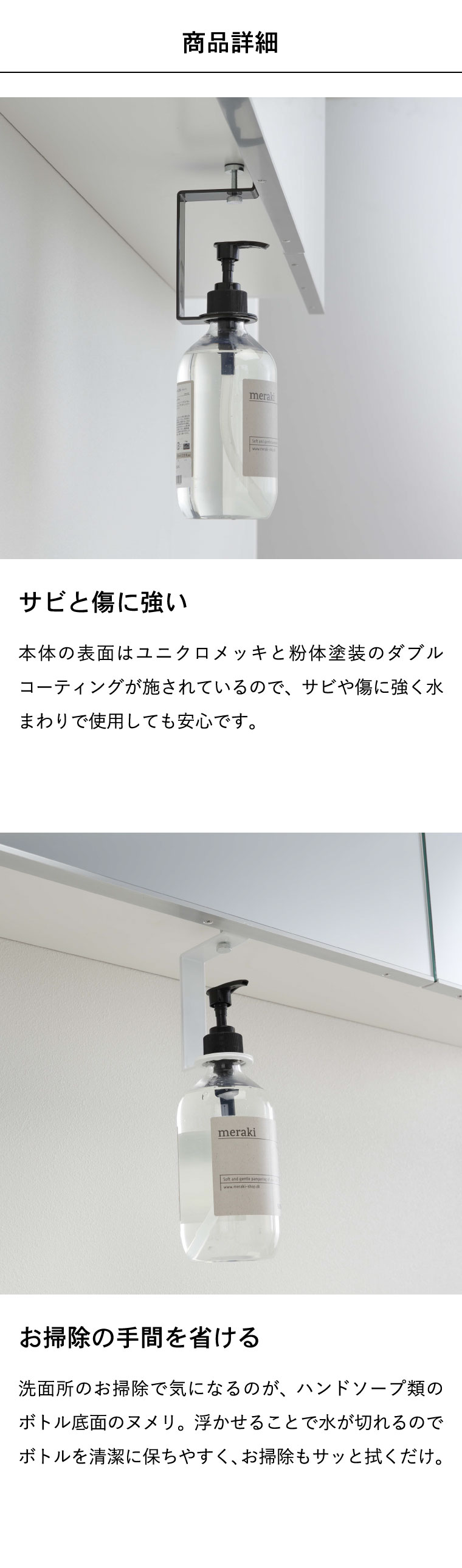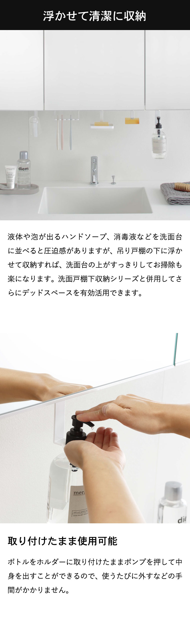 ●対応サイズ:ディスペンサーのねじ込み部分:約2.4cm~約3.2cm以内 容量約750ml以内を目安にしています。取り付け可能な洗面所の吊り戸棚 棚板の厚さ約1.3~3cm以内洗面台と吊り戸棚との間に必要な高さ:約15.7cm+収納するもののサイズ以上