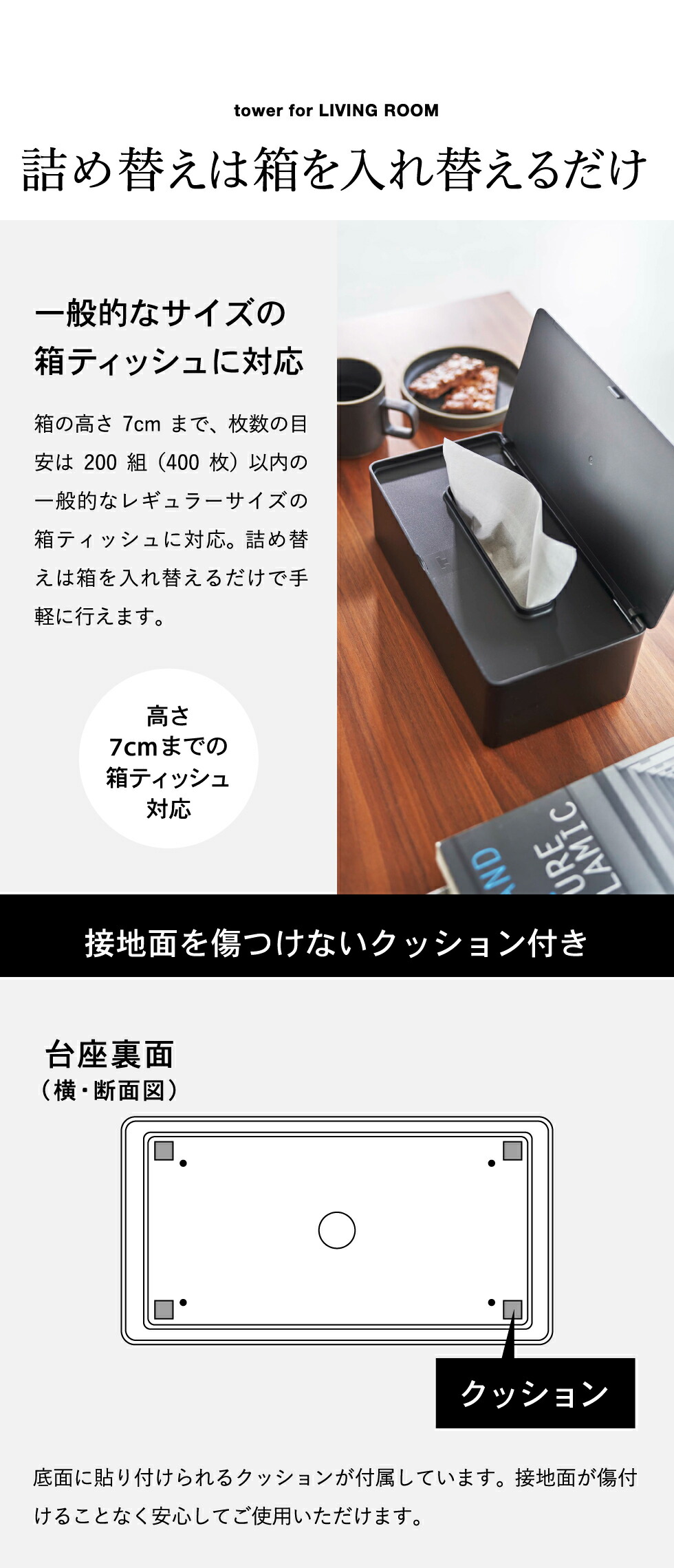 ●対応サイズ:高さ約7cmまでの一般的なティッシュボックス ※枚数の目安:200組(400枚)以内