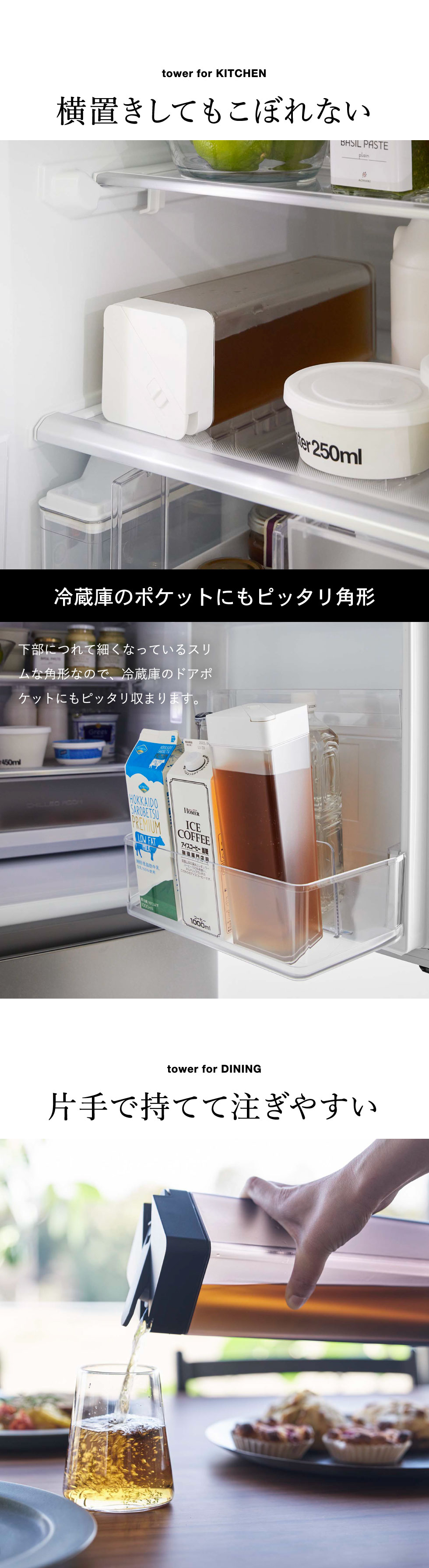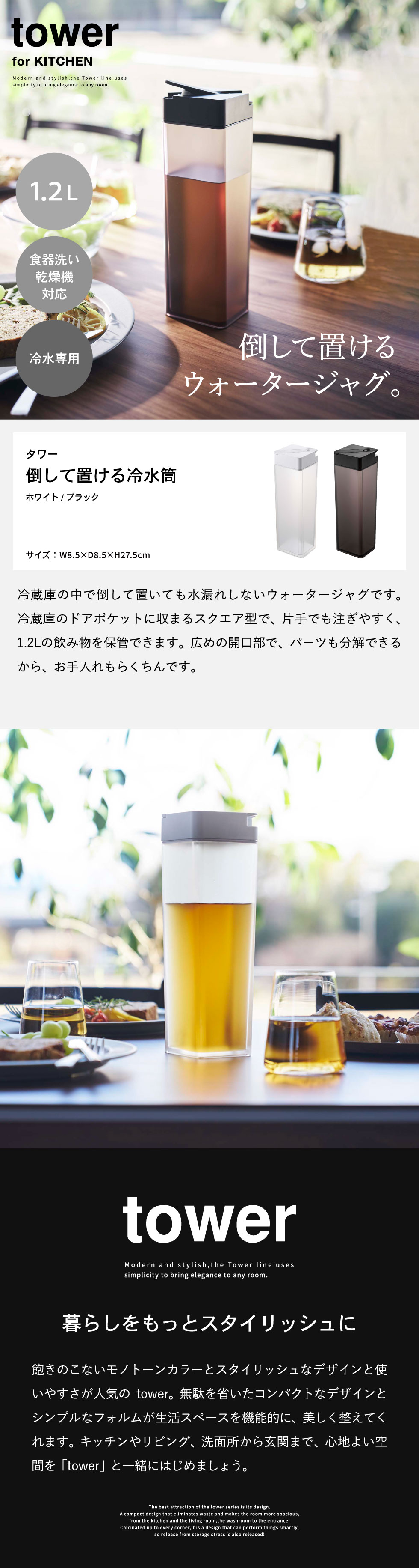 倒して置ける冷水筒 タワー 山崎実業 ホワイト/ブラック 5724 5725