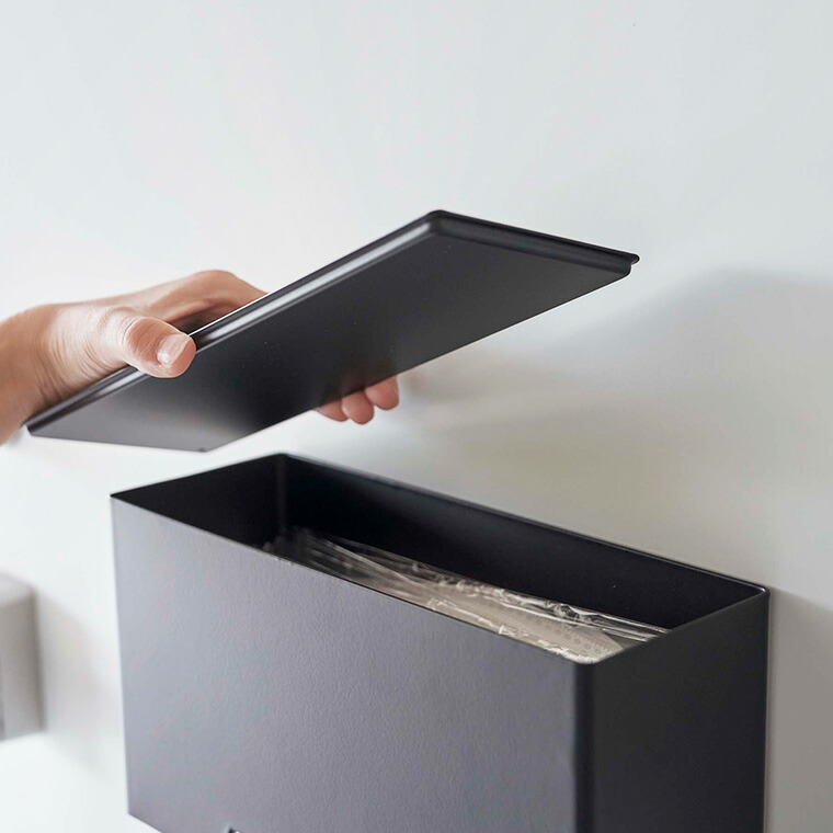 玄関扉に取り付けた場合は、本体下部のスリットからマスクを1枚ずつ引き出せます。底面が斜めにデザインされているので、片手でもスムーズに取り出すことができます。下駄箱やカウンターの上に置いて使用する場合は、フタを外して上からマスクを取り出して使用してください。