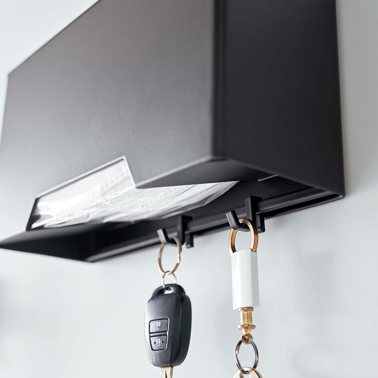 本体底面に取り付けられるフックが2つ付属しているので、小物を引っ掛けて収納することができます。玄関扉に浮かせて取り付ければ、車の鍵などをサッと手に取れてスムーズに外出することができます。フック1つあたり約250gまで掛けられます。