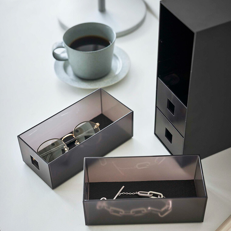 アクセサリーや小物類をスッキリ収納できる引き出しタイプの収納ケースシリーズ。サングラスや時計も傷や汚れをつけずに収納できます。ネックレス&ピアス収納ケース(別売)と並べて使えばアクセサリー小物もまとめて収納できる。すりガラスのようにさり気なく中身が見える引き出しで、隠しながらもすっきり見えるお洒落なデザインです。
