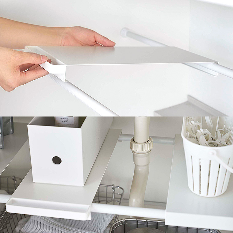 お使いのつっぱり棒にのせるだけで棚が完成!伸縮式なので、使いたい幅に合わせて設置できます。棚はフラットで、細かい小物からボトルなどの不安定なものもしっかり置くことができます。つっぱり棒の上にのせるだけの簡単設置。幅約15cmのスリムタイプで、シンクの排水ホースを避けて設置できます。キッチンツールなどを引っ掛けられる便利なフック付き。つっぱり棒用バスケット(別売)と組み合わせてご使用いただけます。製品ひとつでも上下に分けて2枚で使えば、ランドリーや冷蔵庫横の隙間を収納として有効活用できます。