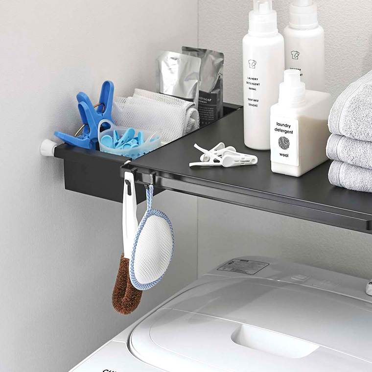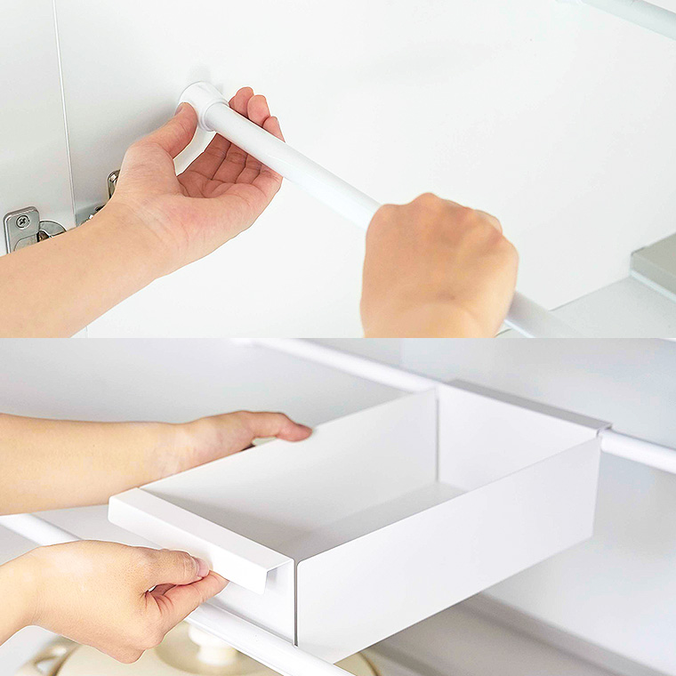 お使いのつっぱり棒にのせるだけのバスケット! キッチンや洗面のシンク下などをスッキリ整頓できます。散らかりがちな細かいお弁当グッズやレトルト食品、スポンジのストックなど、細々したものを収納するのに最適なバスケットタイプ。伸縮つっぱり棒用棚板 L(別売)と組み合わせて洗濯機上などの空いている空間にも活用できます。つっぱり棒の上にのせるだけの簡単設置。キッチンではお弁当グッズなど細々したものの収納に。洗面室ではチューブ類のストックや洗濯ばさみの収納に。