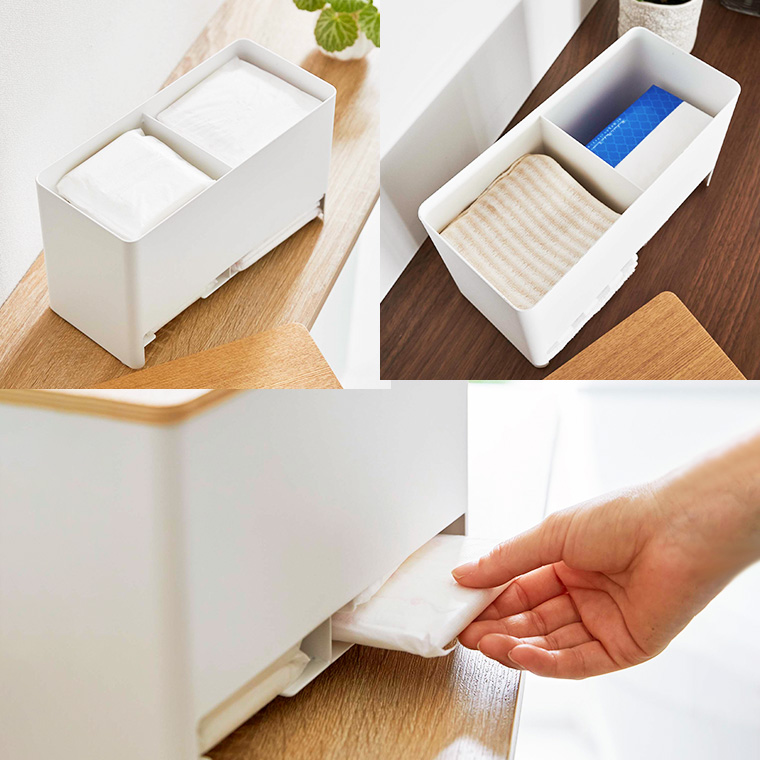 見られたくないサニタリー用品をお洒落に収納。来客時に隠して収納出来るサニタリー用品収納ホルダー。取り出しも簡単。下から取り出せる便利設計です。仕切りがあるので、用途の違うサニタリー用品を分けて収納出来ます。裏を向けると完全に隠すことが出来ます。ハンカチやポケットティッシュの収納にも。