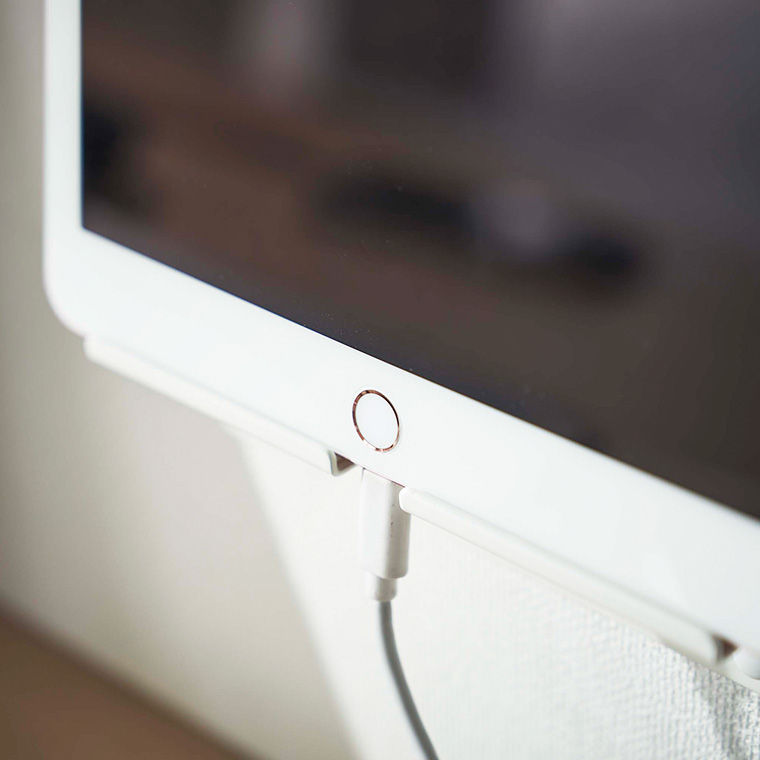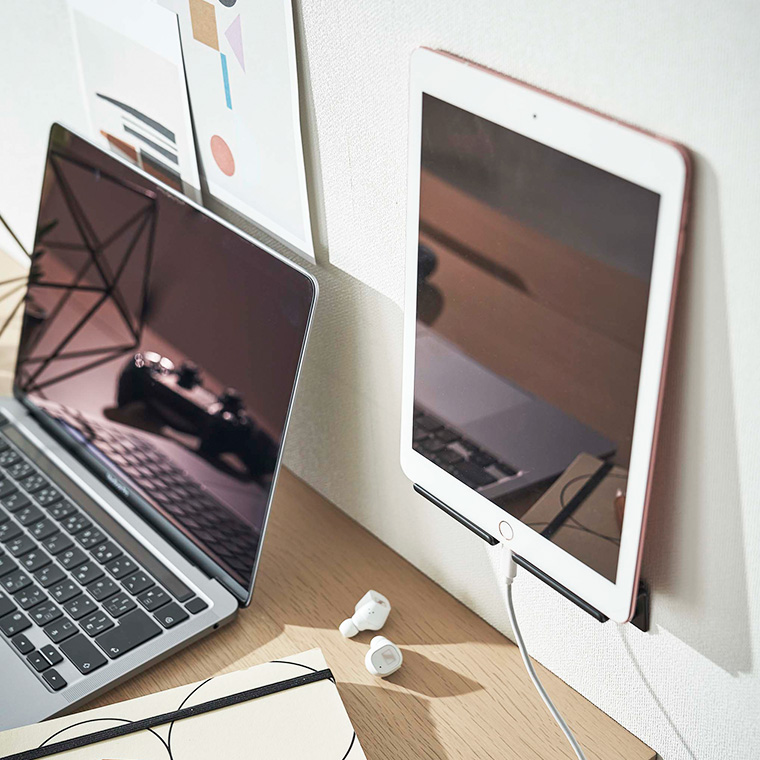 石こうボートピンで簡単取付。スマートフォンやタブレットPCを充電しながら収納。コードを付けたまま使用可能。石こうボードピンで壁の穴が目立ちにくい。木ネジでも設置可能。