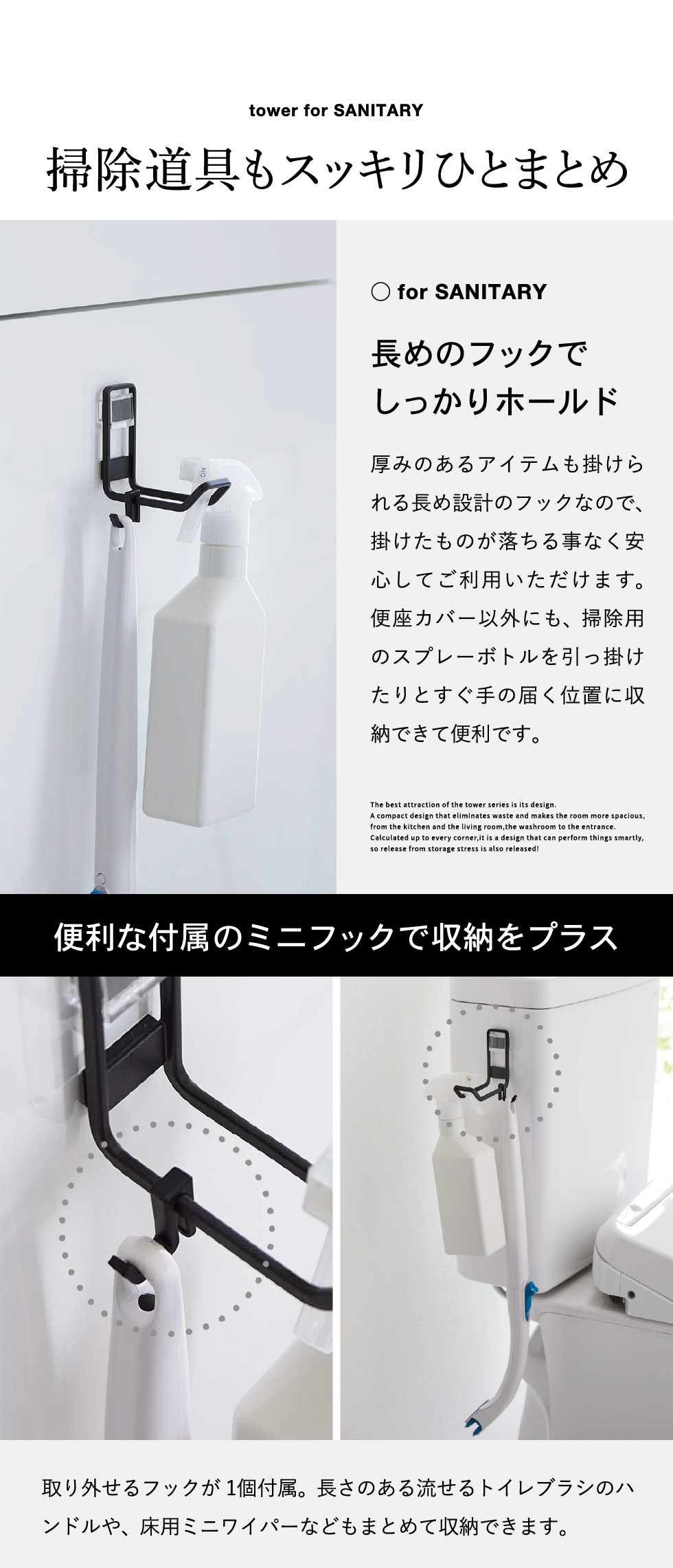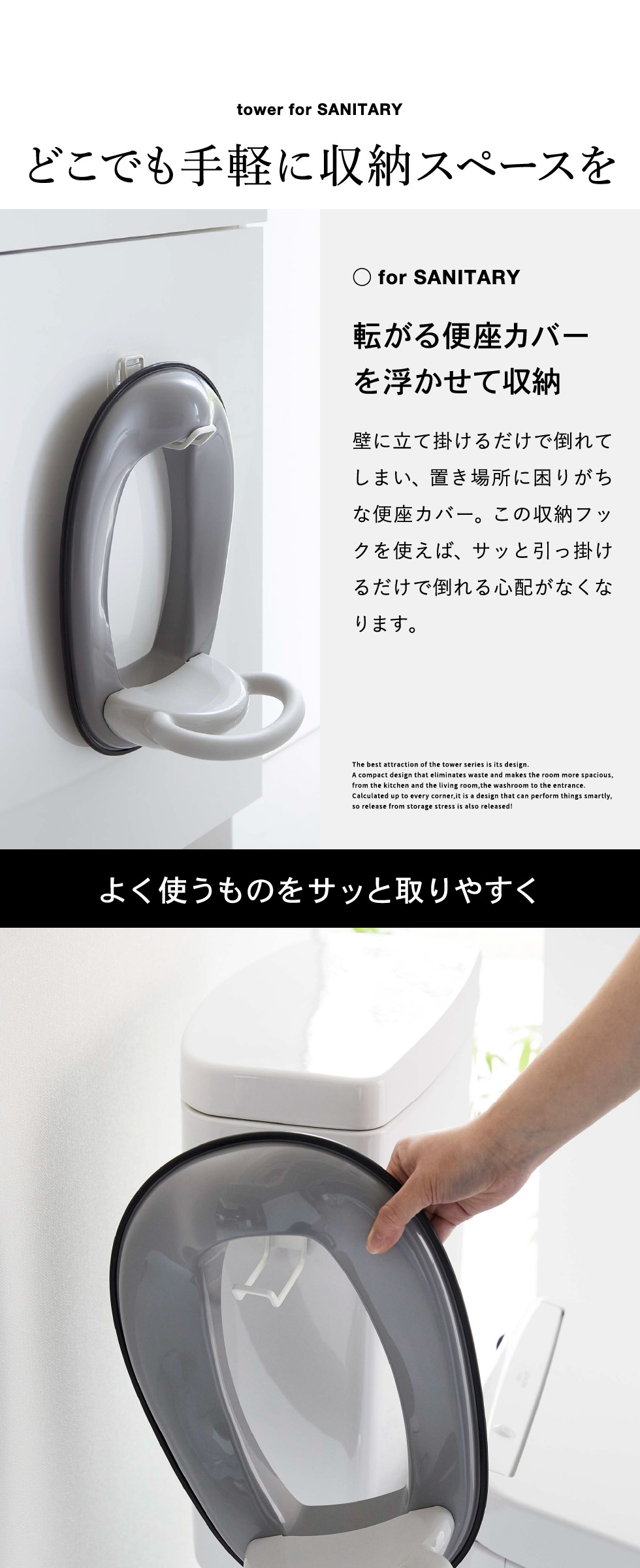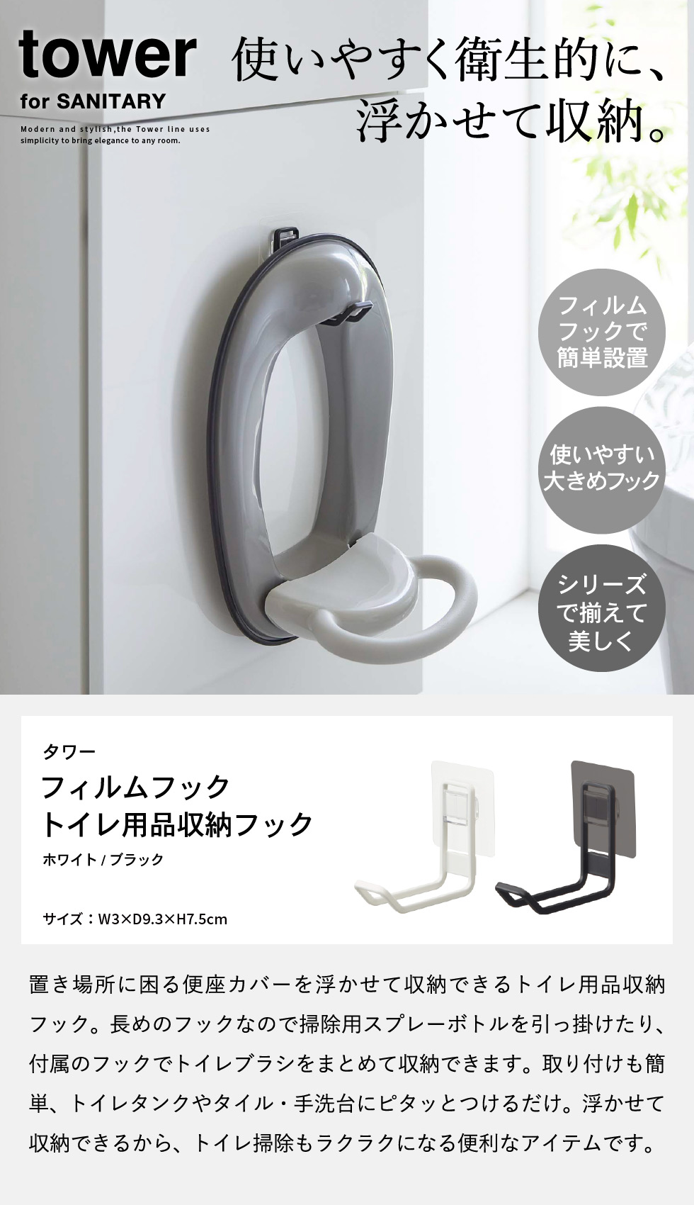 置き場所に困る便座カバーを浮かせて収納できるトイレ用品収納フック。長めのフックなので掃除用スプレーボトルを引っ掛けたり、付属のフックでトイレブラシをまとめて収納できます。取り付けも簡単、トイレタンクやタイル・手洗台にピタッとつけるだけ。浮かせて収納できるから、トイレ掃除もラクラクになる便利なアイテムです。