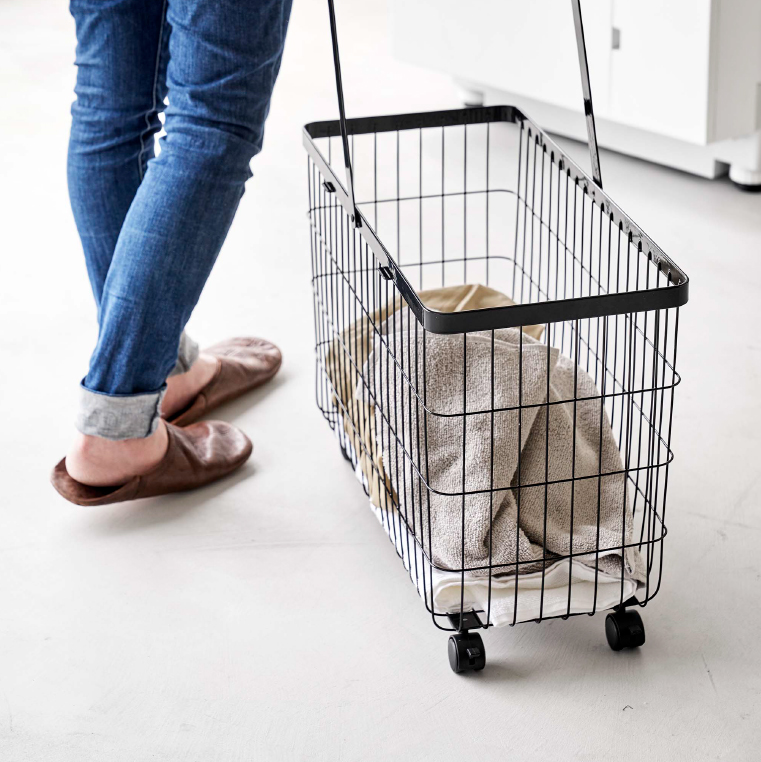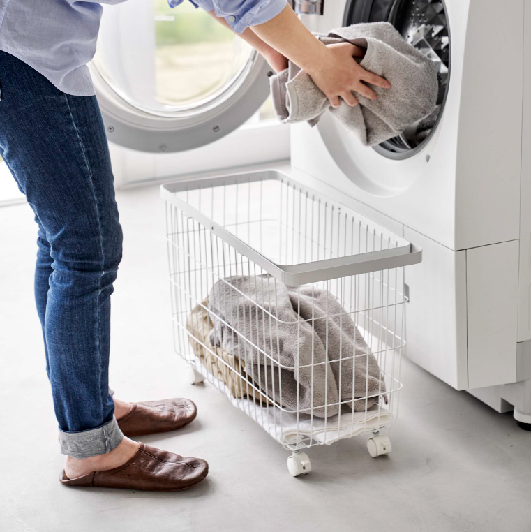ドラム式洗濯機の幅に合わせやすいtowerの「ランドリーバスケット キャスター付き ワイド&ロー」。ドラム式洗濯機の扉の開閉もスムーズにできるロータイプで、キャスターも付いているのでラクに移動ができます。ワイヤーでデザインされたバスケットは通気性がよく、湿気がこもりにくいのが魅力のひとつです。
