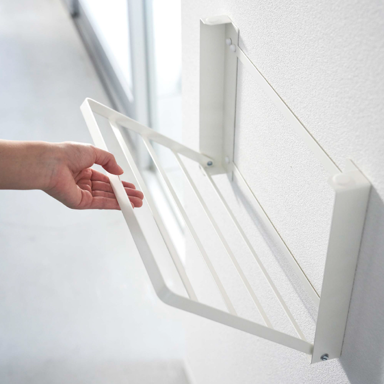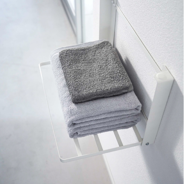 石こうボードピンで壁に取り付けてスリムに使える折りたたみ棚。合計5枚のバスタオルを掛けられ、着替えの一時置きにも便利にお使いいただけます。また、取り付ける壁に合わせて使える木ピンも付属しております。