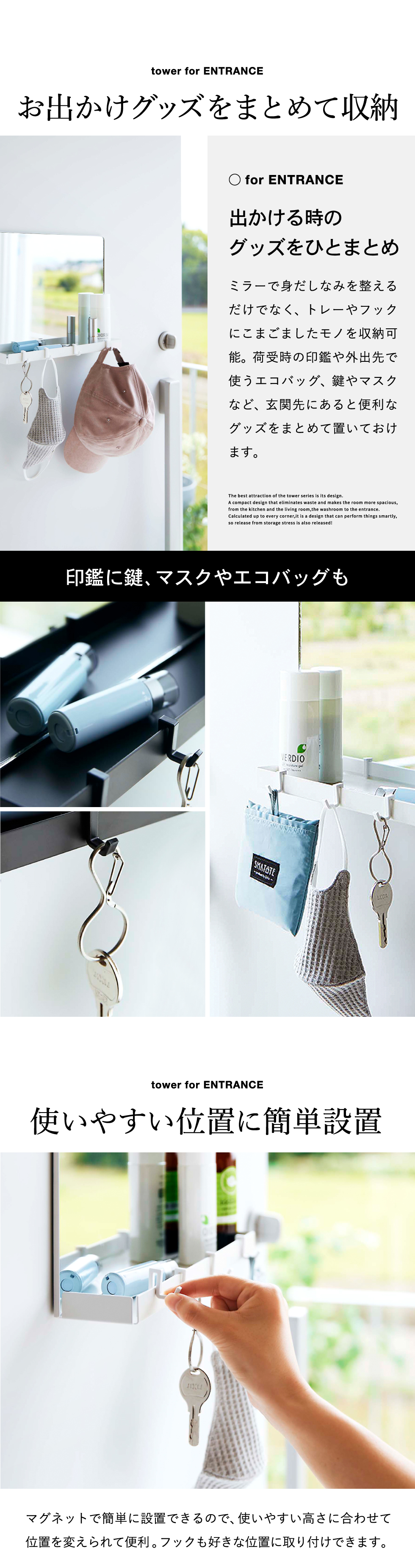 ミラーで身だしなみを整えるだけでなく、トレーやフックにこまごましたモノを収納可能。荷受時の印鑑や外出先で使うエコバッグ、鍵やマスクなど、玄関先にあると便利なグッズをまとめて置いておけます。