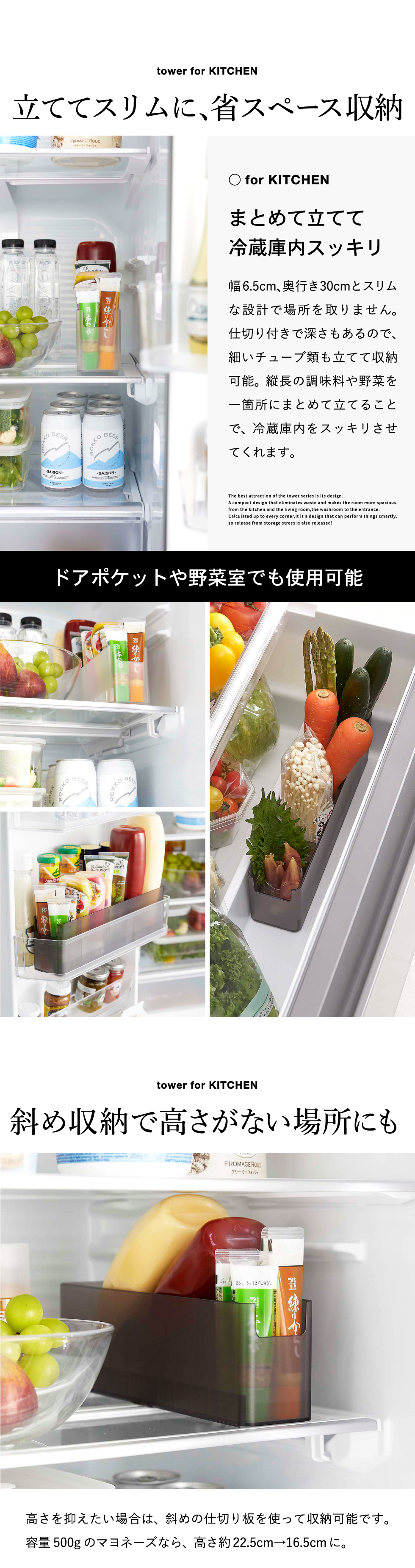 幅6.5cm、奥行き30cmとスリムな設計で場所を取りません。仕切り付きで深さもあるので、細いチューブ類も立てて収納可能。縦長の調味料や野菜を一箇所にまとめて立てることで、冷蔵庫内をスッキリさせてくれます。ドアポケットや野菜室でも使用可能です。