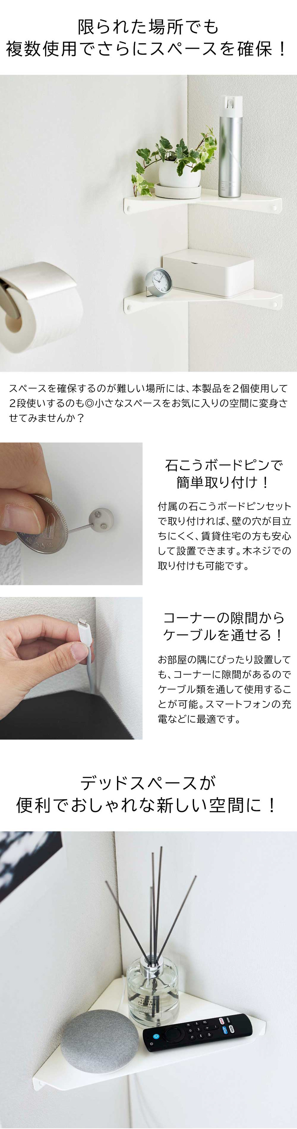 デッドスペースになりがちなお部屋のコーナー部分に設置することで、新たな雰囲気の空間が生まれます。ベッドサイドでは時計やメガネ、寝る前に読む文庫本を置いたり、トイレではディフューザーやスプレー、予備のトイレットペーパーやサニタリー用品を置いたりなど。耐荷重も約3kgと充分で、用途に応じて活躍の場は広がります。小さなスペースをお気に入りの空間に変身させてみませんか?