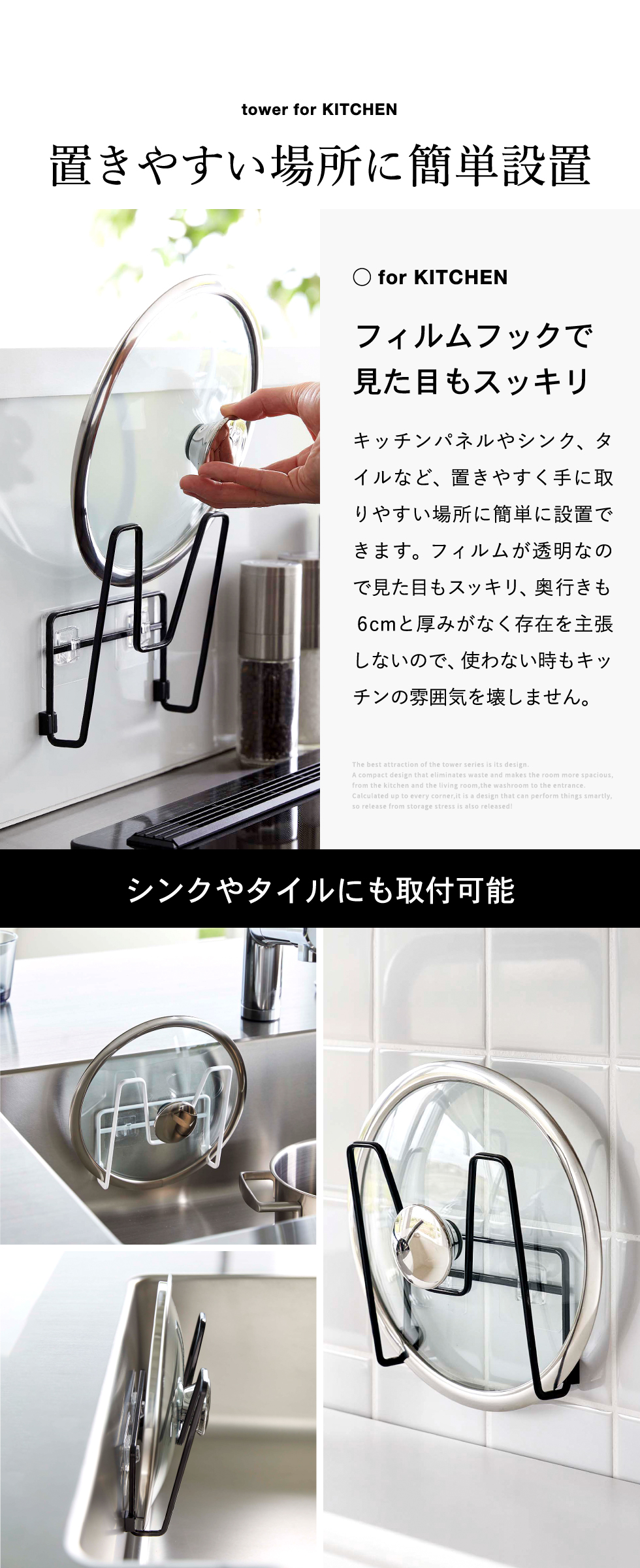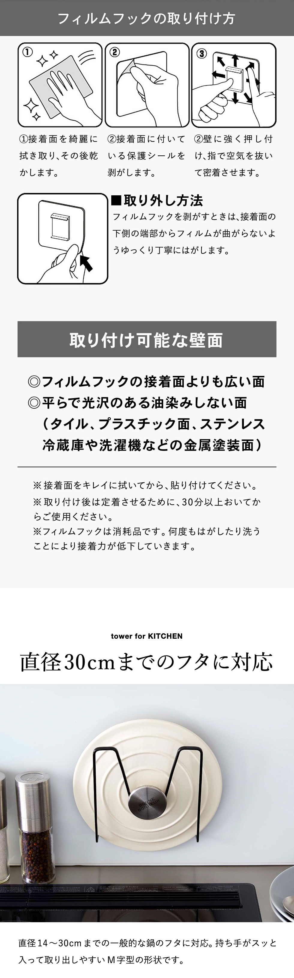 調理中の鍋蓋の一時置きに便利な鍋蓋ホルダー。フィルムフックで手に取りやすい場所に簡単に設置可能。持ち手がスッと入るM字型で、料理の味付けや味見で少しだけフタを置きたい時に便利です。使わない時は、まな板を置いたり食品トレイを乾かしても◎。