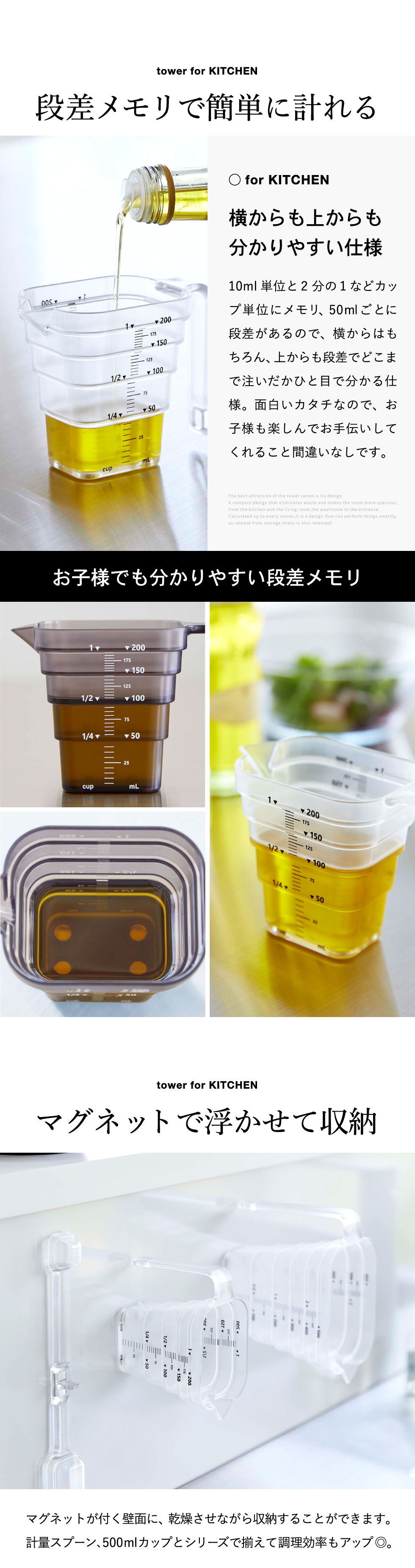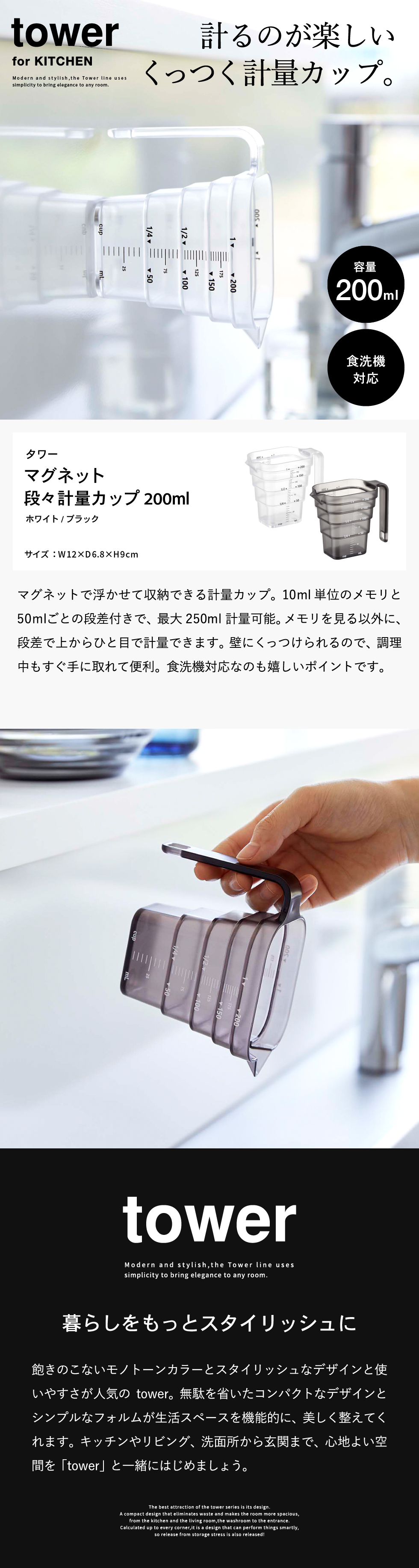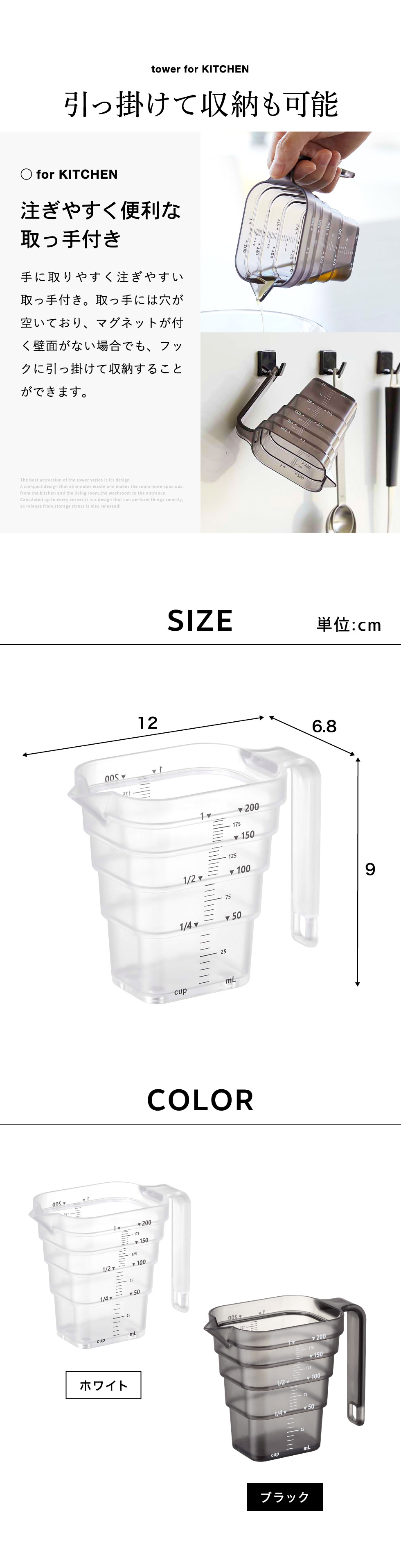 山崎実業 tower マグネット段々計量カップ タワー 200mL ホワイト/ブラック 6919 6920
