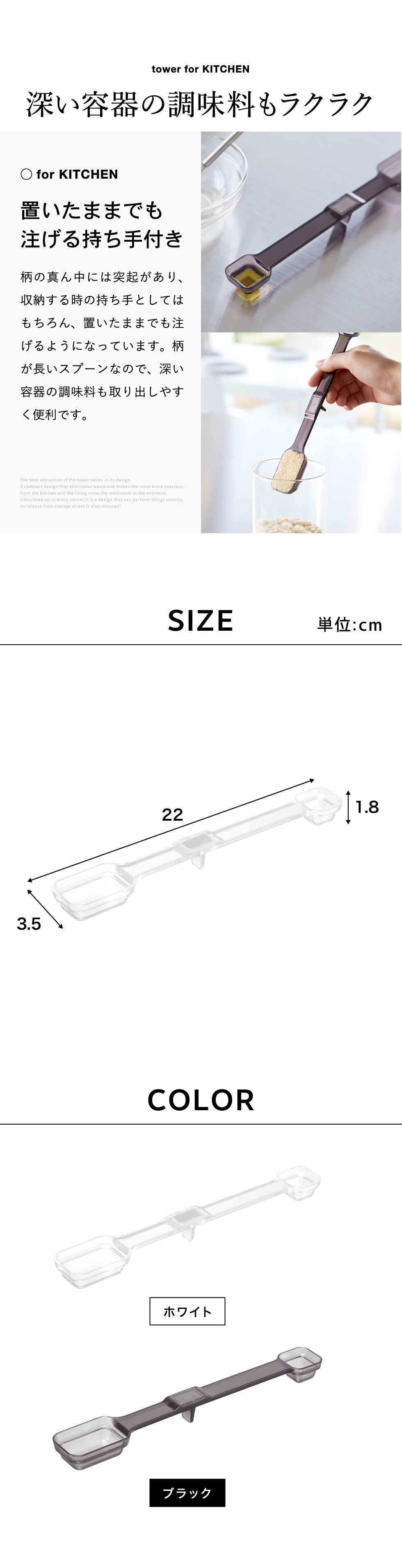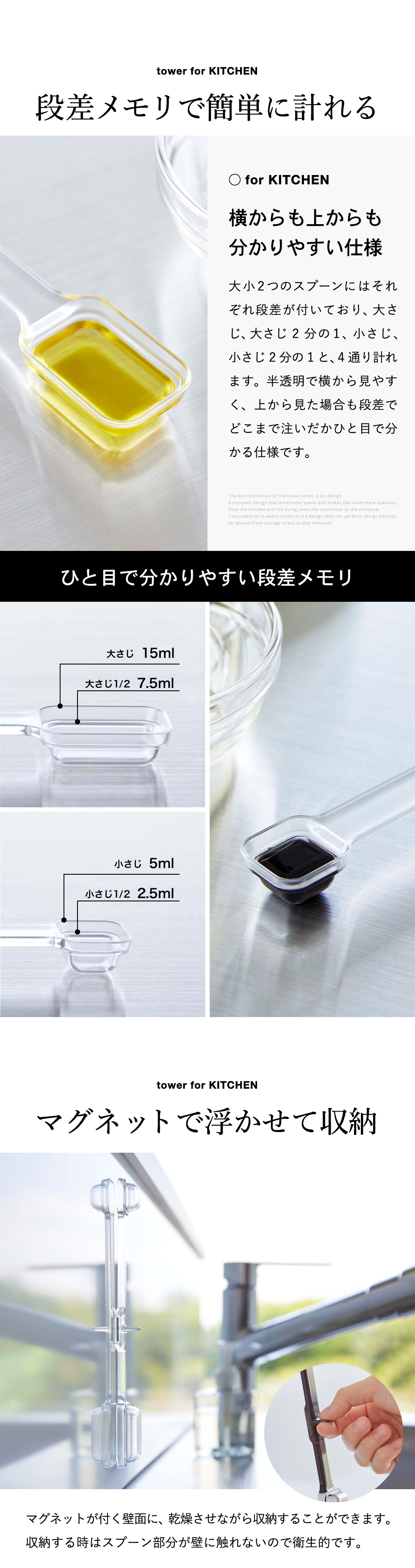 大小2つのスプーンにはそれぞれ段差が付いており、大さじ、大さじ2分の1、小さじ、小さじ2分の1と、4通り計れます。半透明で横から見やすく、上から見た場合も段差でどこまで注いだかひと目で分かる仕様です。