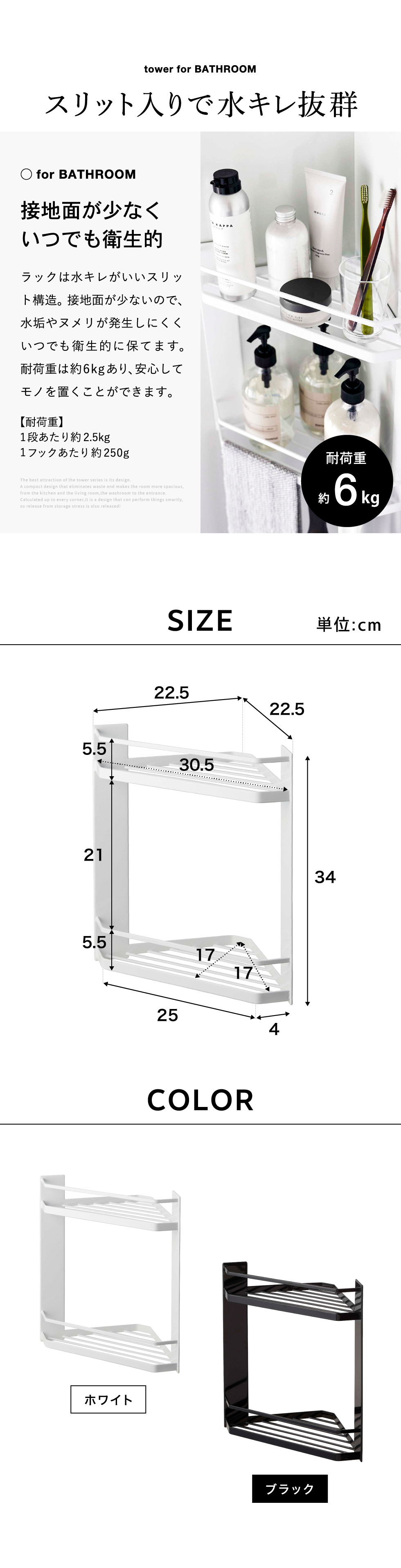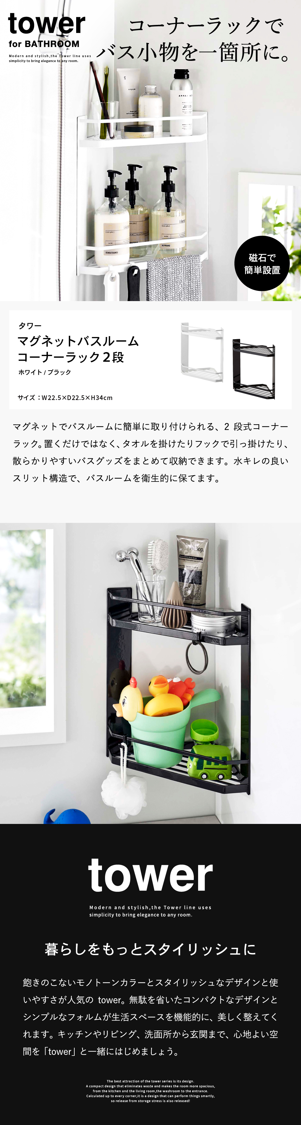 マグネットでバスルームに簡単に取り付けられる、2段式コーナーラック。置くだけではなく、タオルを掛けたりフックで引っ掛けたり、散らかりやすいバスグッズをまとめて収納できます。水キレの良いスリット構造で、バスルームを衛生的に保てます。