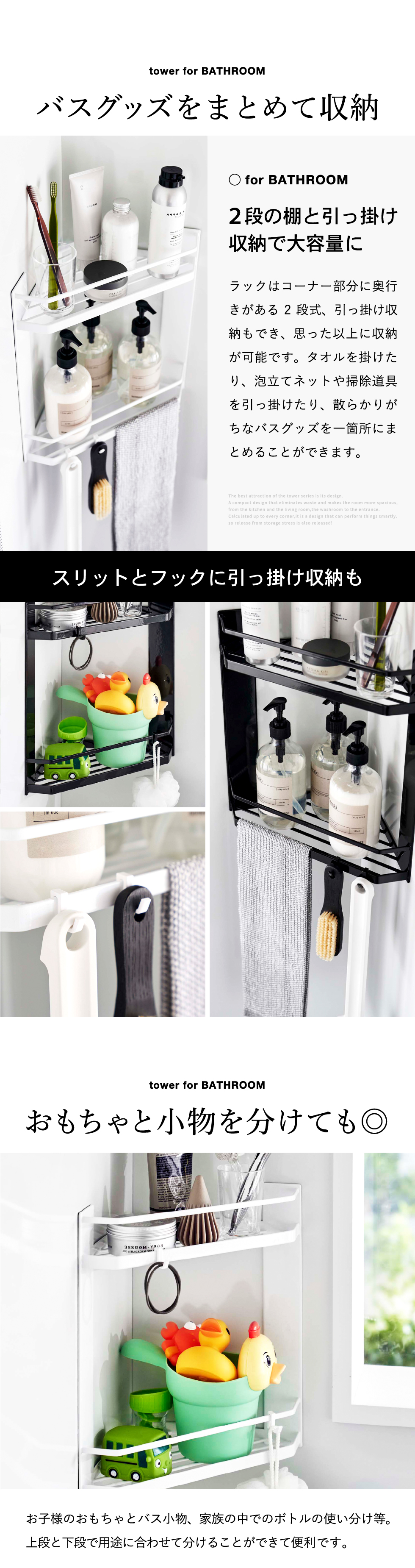 ラックはコーナー部分に奥行きがある2段式、引っ掛け収納もでき、思った以上に収納が可能です。タオルを掛けたり、泡立てネットや掃除道具を引っ掛けたり、散らかりがちなバスグッズを一箇所にまとめることができます。フックはもちろんスリットに引っ掛けてることもできて便利です。