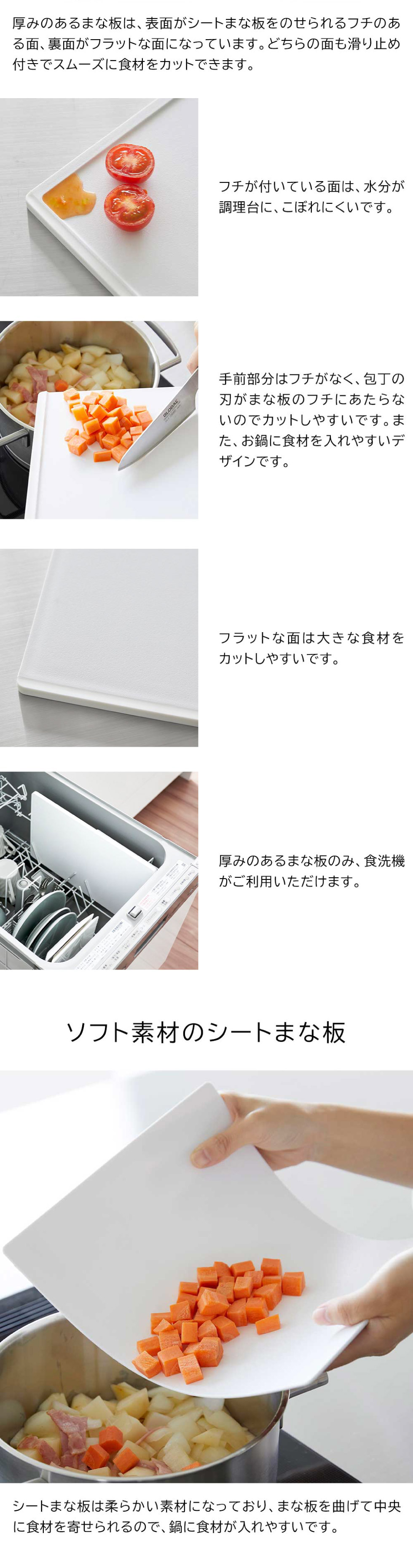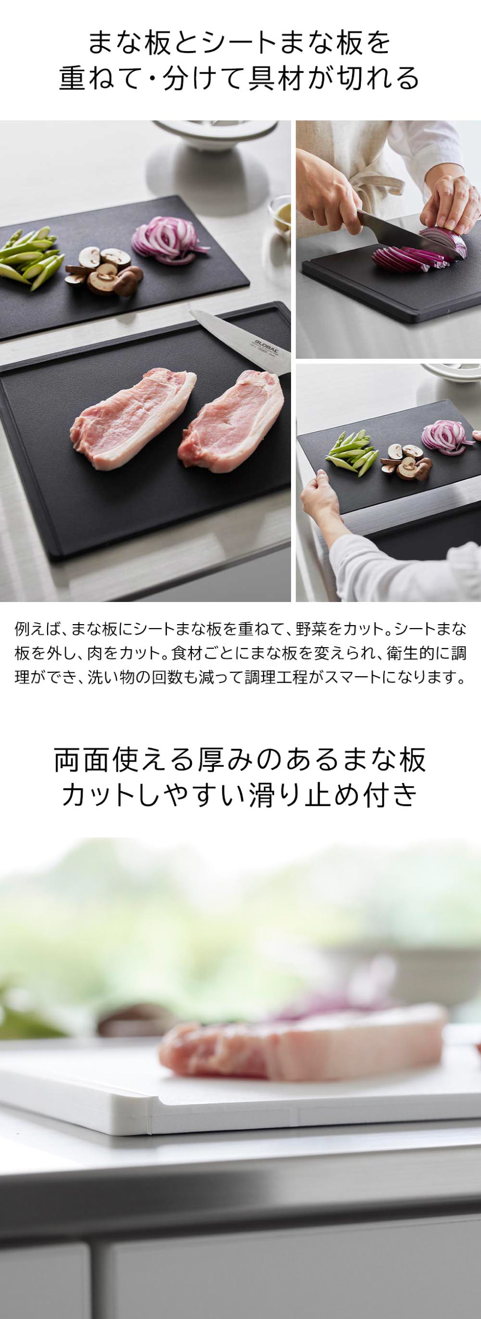 シートまな板で野菜、厚手のまな板で鮮魚や鮮肉といったように食材ごとに使い分けて切れるので衛生的です。厚手のまな板はフラットな面とフチがある面があり両面とも使用可能。大きい食材はフラットな面で、フチがある面は水分が出るものと、切る食材で分けても◎。