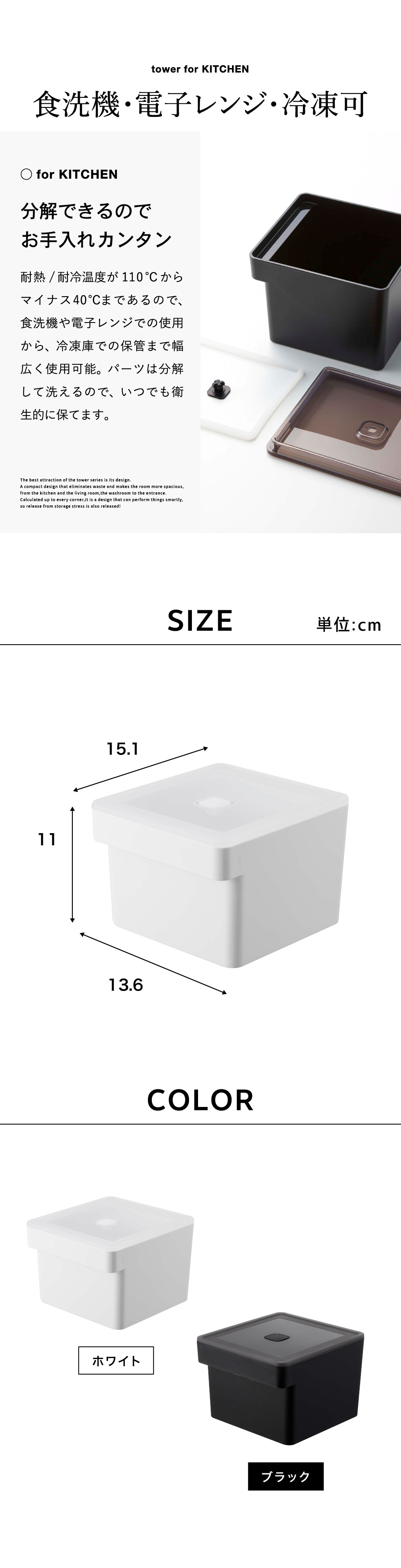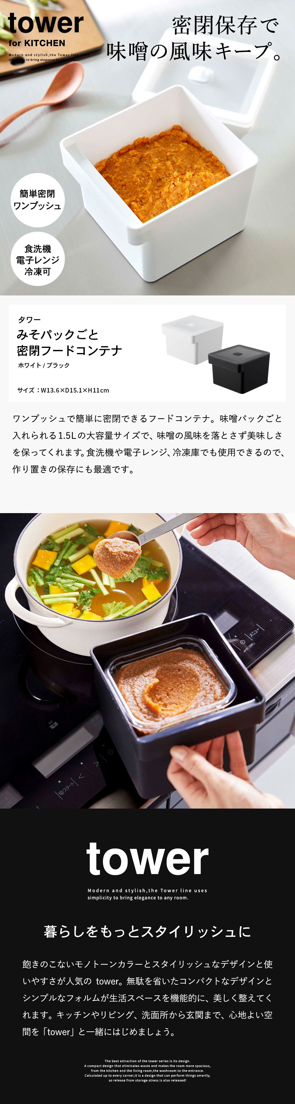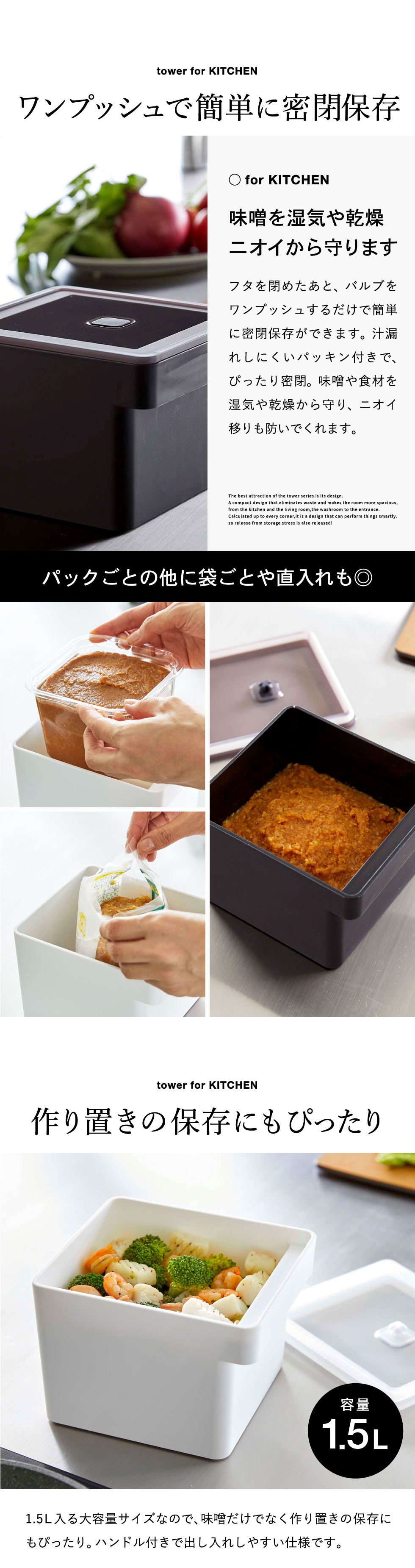 みそパックごと収納ハンドル付き密閉フードコンテナ タワー山崎実業 tower ホワイト/ブラック 7737 7738