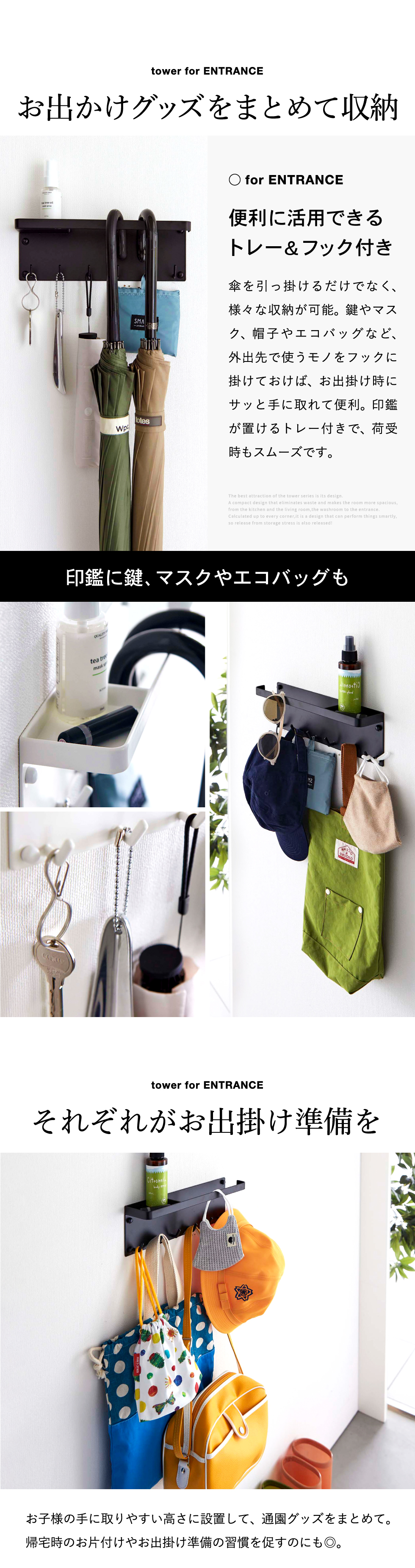 傘を引っ掛けるだけでなく、様々な収納が可能。鍵やマスク、帽子やエコバッグなど、外出先で使うモノをフックに掛けておけば、お出掛け時にサッと手に取れて便利。印鑑が置けるトレー付きで、荷受時もスムーズです。