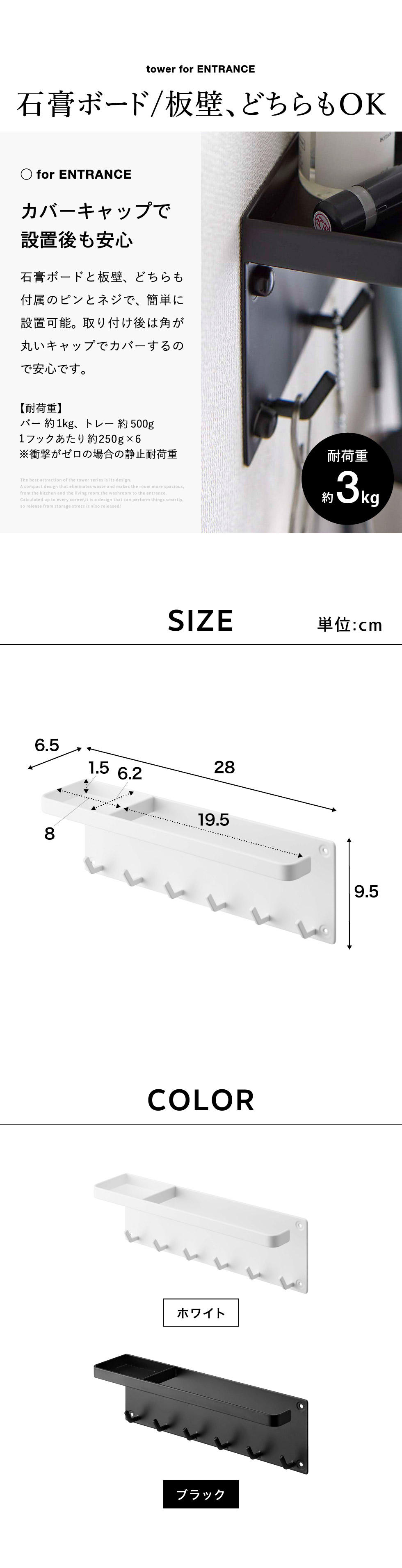 ●耐荷重:バー:約1kg フック1つあたり:約250g トレー:約500g(衝撃をゼロとした場合の静止耐荷重です。)