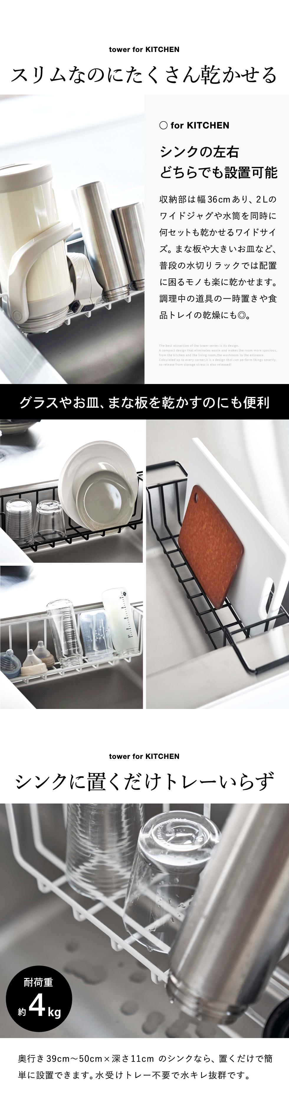 奥行き39cm~50cm×深さ11cmのシンクなら、置くだけで簡単に設置できます。水受けトレー不要で水キレも抜群で、しっかり乾かせます。