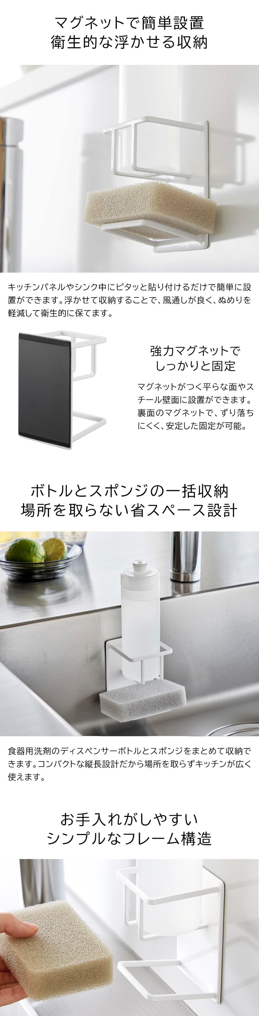マグネットが付く面にぴったり密着。よく使うスポンジと洗剤を手に取りやすい場所に簡単に設置できます。シンプルな構造なので、見た目もスッキリです。