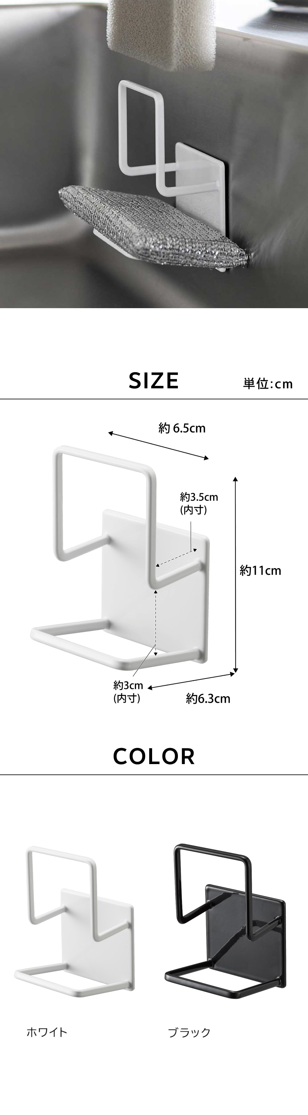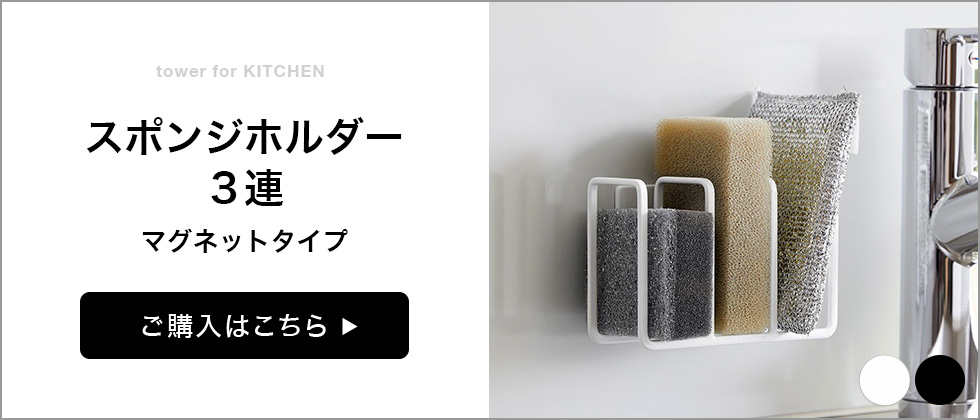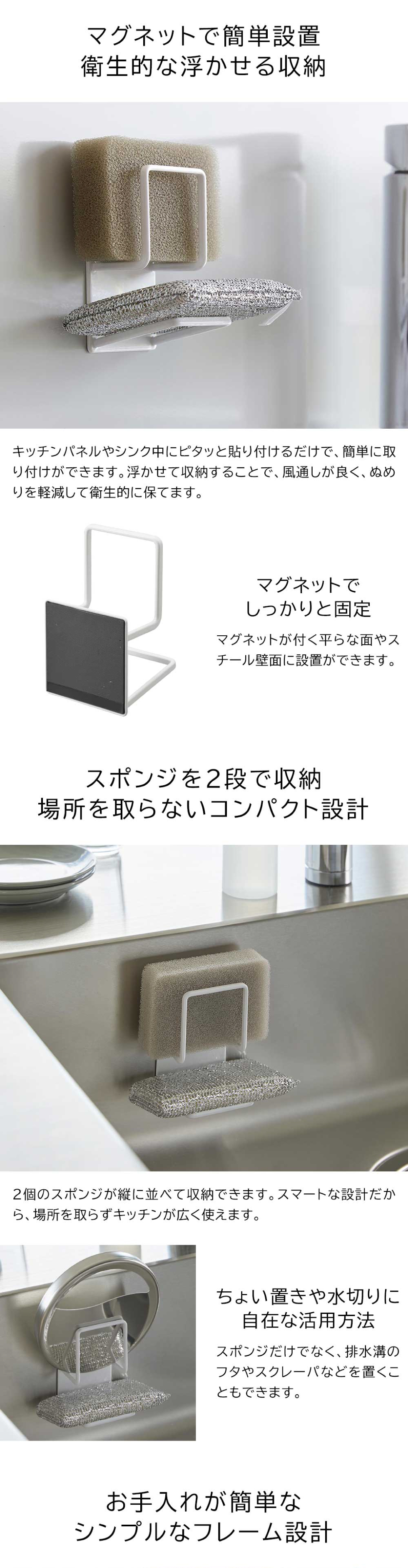 マグネットで浮かせて収納できるスポンジホルダー。普段よく使うスポンジを2つ縦に省スペース収納できます。下段のスポンジを置く部分は手前に向かって上向きになっており、取り出しやすい仕様。浮かせているのでお掃除もスムーズ、キッチンを衛生的に保てます。