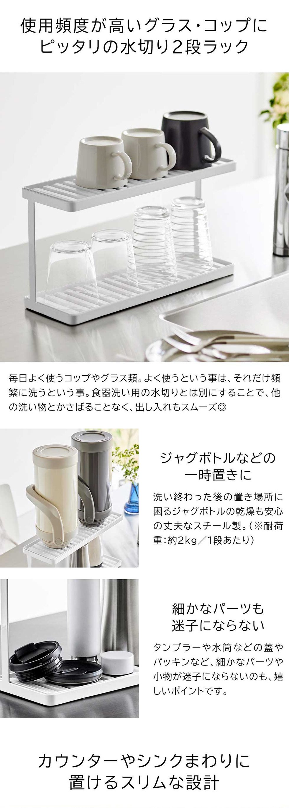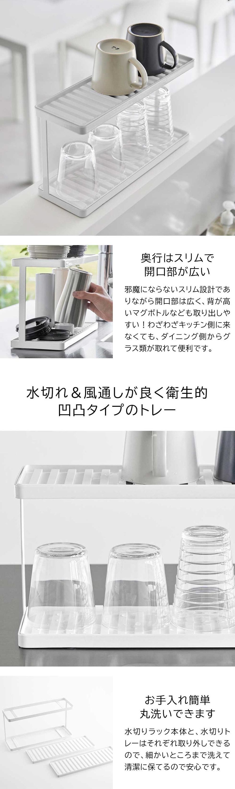 食器よりも使用頻度が高い、グラスやコップ、タンブラーやマグボトルを乾かすのに便利なスタンド。奥行き12cmのスリムタイプ設計で、カウンターキッチン上やシンクまわりのわずかなスペースに設置可能。いつもの水切りラックにプラスすることでコップやグラスの出し入れがしやすくなります。洗った後に場所をとるジャグボトルの一時置きにも。